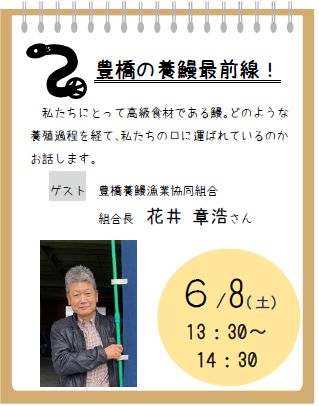 6月8日(土)は、豊橋養鰻漁業協同組合の花井章浩組合長です。「豊橋の養鰻最前線!」と題し、高級食材の鰻がどのような養殖過程を経て私たちの口に運ばれているのかを語ります。