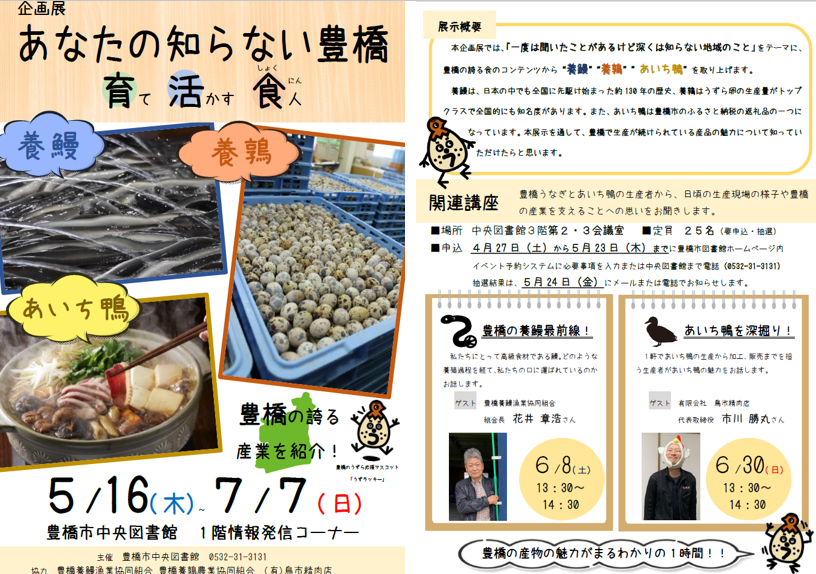 愛知県豊橋市中央図書館で5月16日(木)から、「一度は聞いたことがあるけど深くは知らない地域のこと」をテーマに、豊橋の誇る食のコンテンツから養鰻、養鶉(ようじゅん)、あいち鴨を取り上げる企画展「あなたの知らない豊橋-育て、活かす食人(しょくにん)」が開催中。