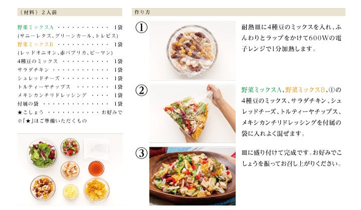 味の決め手となるメキシカンチリドレッシングは、ガーリックやはちみつ、赤とうがらしや赤ワインビネガーを使用し甘辛く仕上げました。ふわシャキ野菜やパリっと軽い食感のトルティーヤチップスと絡めてお召し上がりください。付属の袋に入れてフリフリするだけで簡単に作ることができます。