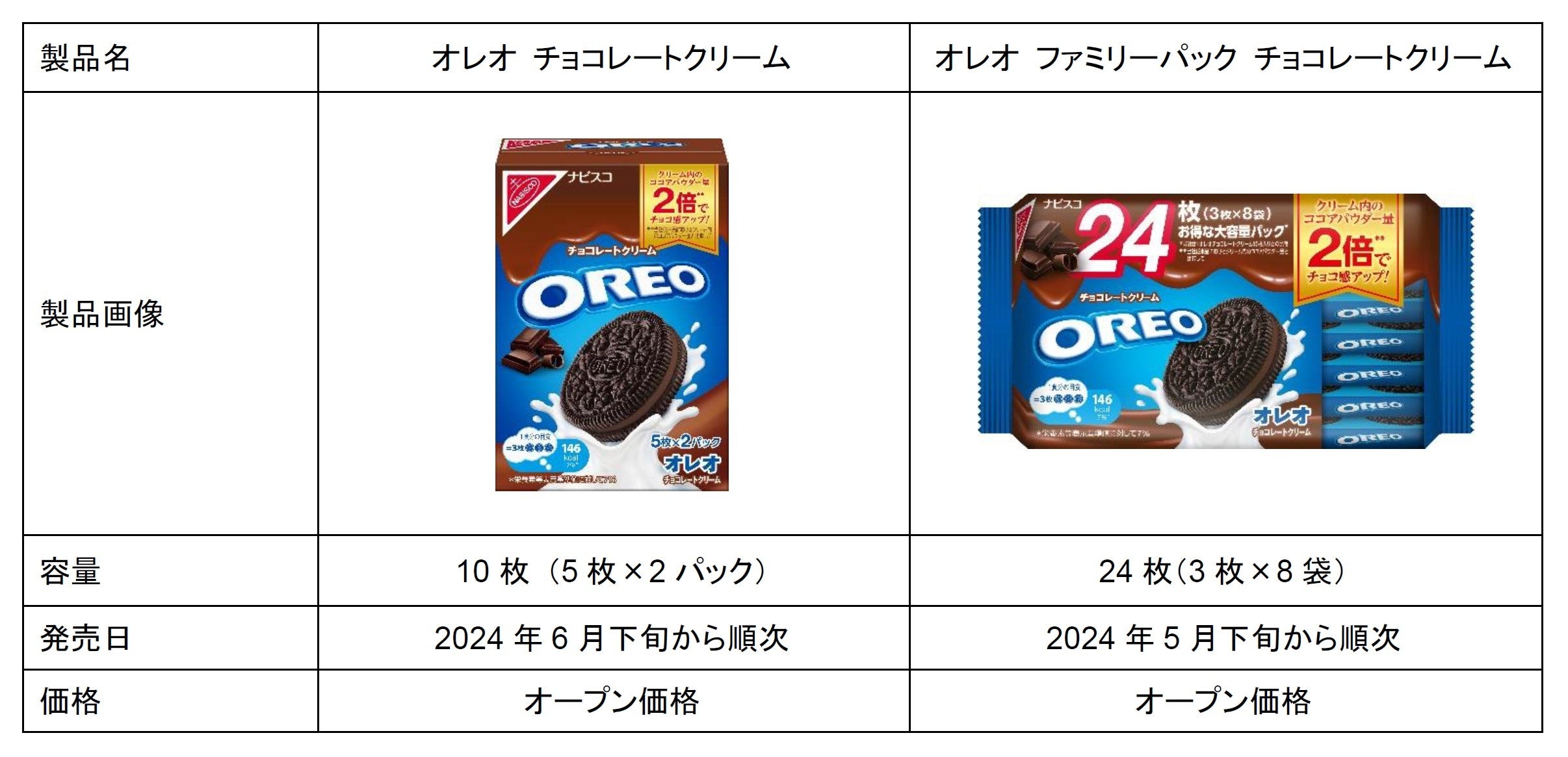 近年、消費者はしっかりとした濃厚な味わいを求める傾向にあり、「オレオ チョコレートクリーム」「オレオ ファミリーパックチョコレートクリーム」の従来品に対して、「食べやすいけれど、もっとチョコ感が欲しい」などのご意見をいただいてきました。そのような声にお応えして、チョコレートクリーム内のココアパウダーを2倍に増量して、チョコレートの濃厚な味わいをお楽しみいただけるようリニューアルしました。発売前の事前調査では、「濃厚でしっかりとしたチョコの味が感じられる」「リッチでおいしいチョコ味」「ちょうどよい甘さ」といった好感をいただいています。また、リニューアルに合わせて、“チョコ感アップ!”がわかりやすいパッケージデザインに刷新しました。