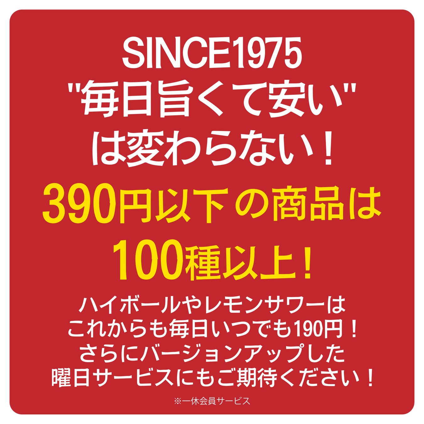 会員サービスでは引き続きいつでもジムビームハイボール、こだわり酒場レモンサワーは190円でご提供いたします。さらにパワーアップした曜日サービスにご期待ください。