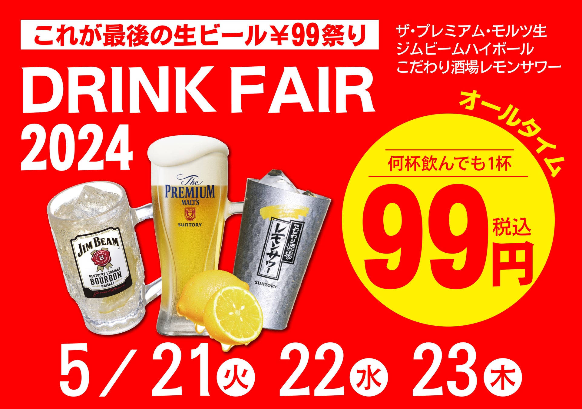 全時間帯何杯飲んでも1杯99円(税込)にてご提供いたします。