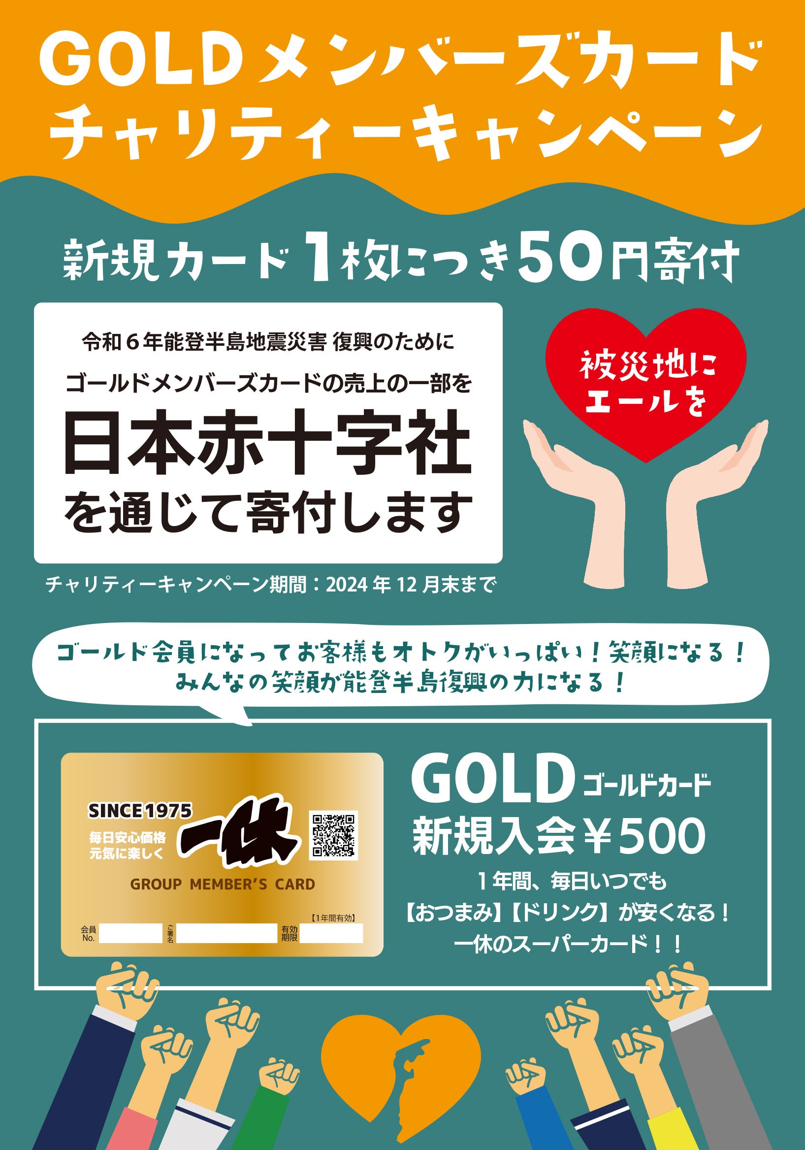 この地震を受け、居酒屋一休は被災地支援の取り組みとして2024年12月末までの期間中ゴールド会員新規入会1枚につき50円を日本赤十字社を通し被災地に寄付させていただきます。