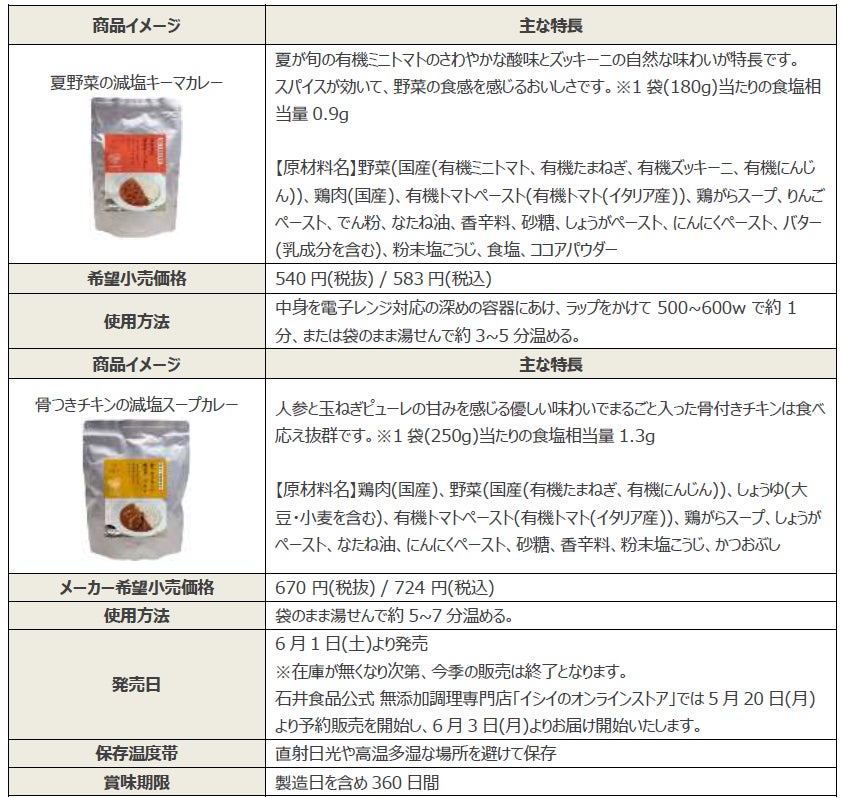 日本人の食塩摂取量の平均は10.1g※3 であり、目標量として設定されている成人1 人1 日当たり男性7.5g 未満、女性では6.5g 未満※4 を大きく超過している現状で、日々の食事の塩分量が多くなってしまう傾向にあります。そのため、「おいしい食事を楽しみたいけど塩分が気になる」と思う大切な方にも夏ギフトとしてお送りいただけるよう塩分40%カット※2 で国産有機野菜を使った『夏野菜の減塩キーマカレー』、『骨つきチキンの減塩スープカレー』を開発いたしました。