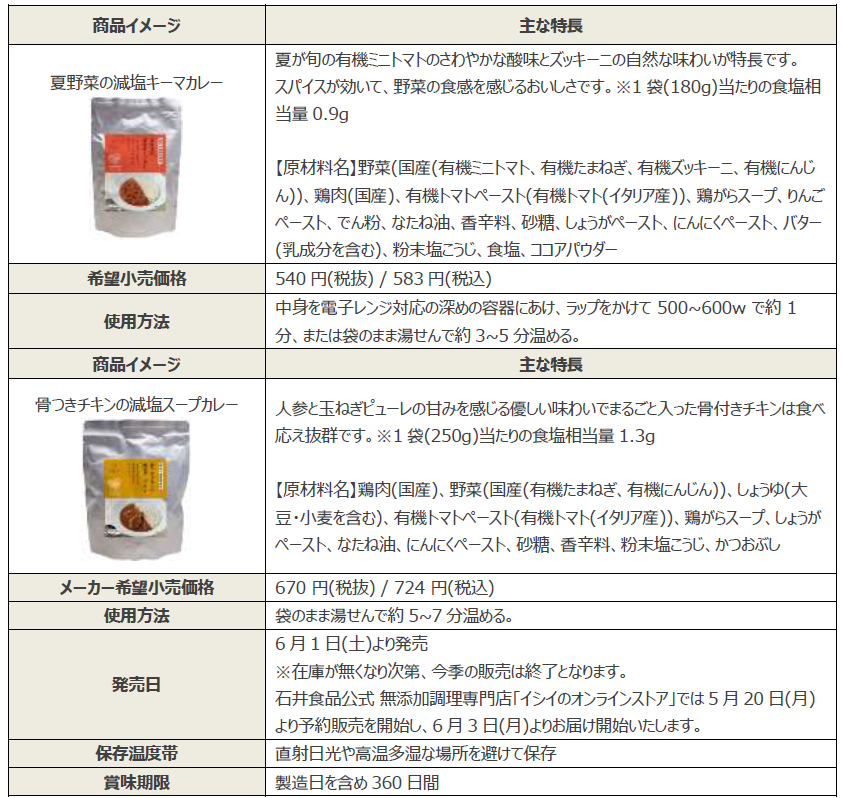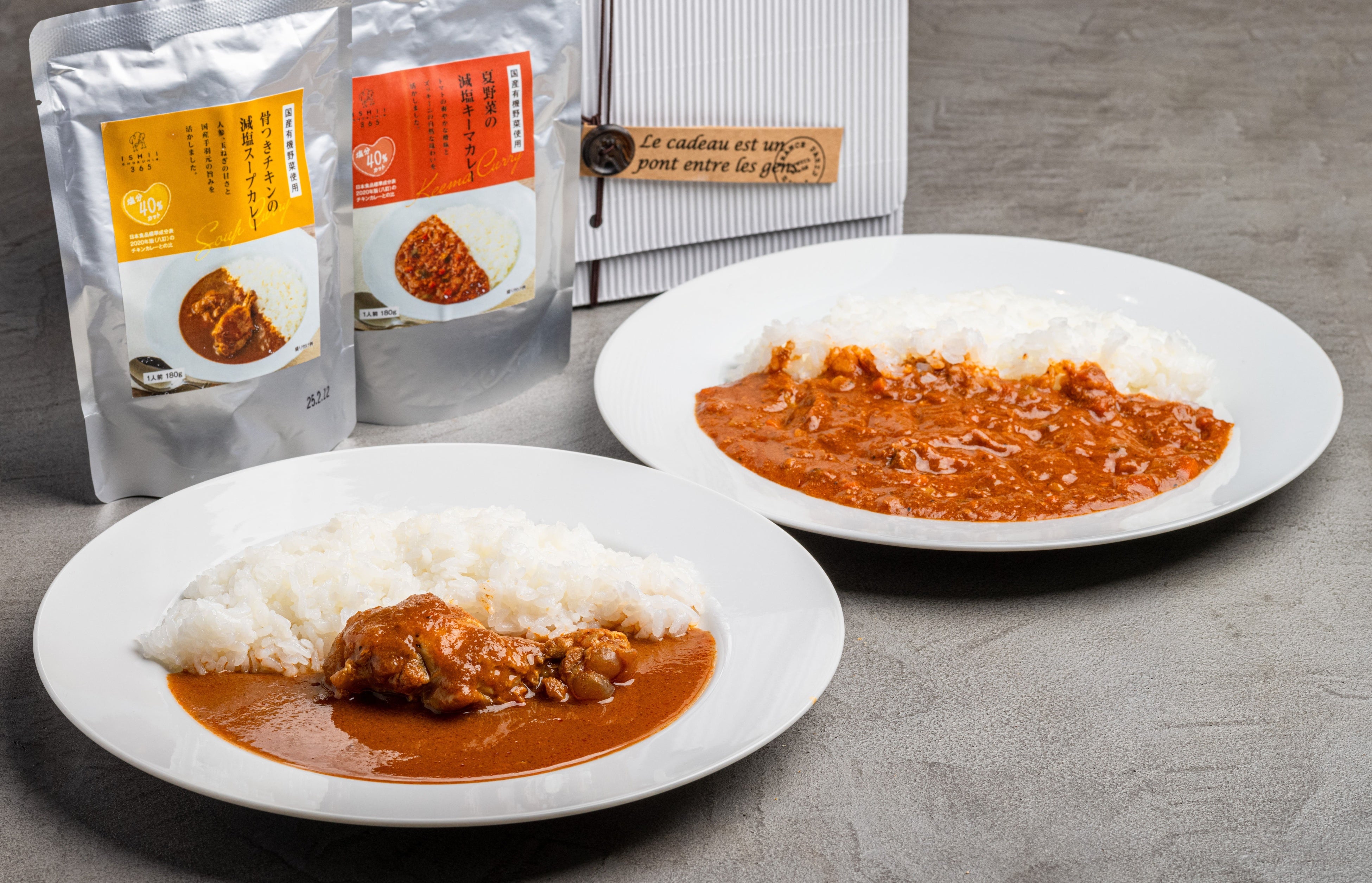 日本人の食塩摂取量の平均は10.1g※3 であり、目標量として設定されている成人1 人1 日当たり男性7.5g 未満、女性では6.5g 未満※4 を大きく超過している現状で、日々の食事の塩分量が多くなってしまう傾向にあります。そのため、「おいしい食事を楽しみたいけど塩分が気になる」と思う大切な方にも夏ギフトとしてお送りいただけるよう塩分40%カット※2 で国産有機野菜を使った『夏野菜の減塩キーマカレー』、『骨つきチキンの減塩スープカレー』を開発いたしました。