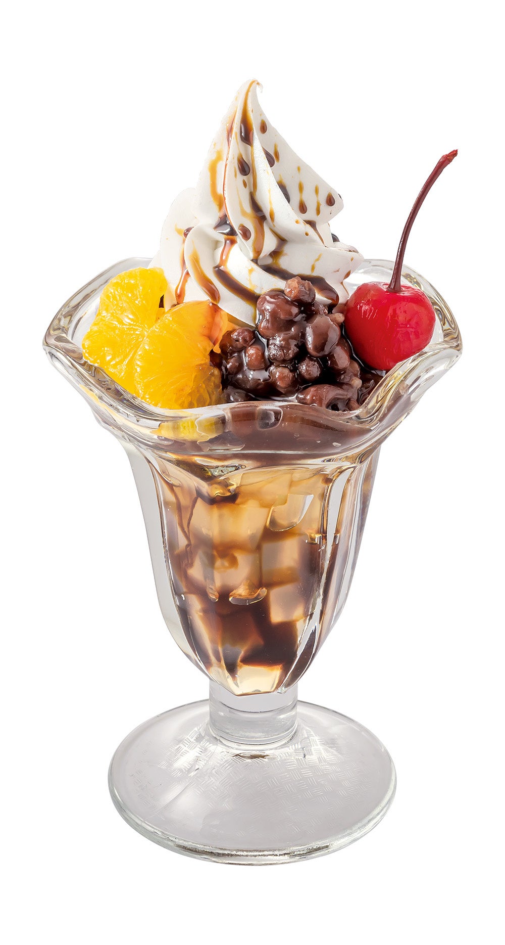 ひんやりとしたさっぱりと食べやすい寒天に、相性抜群の黒蜜をたっぷりかけました。オリジナルのソフトクリームと混ぜ合わせて食べることで、より絶品な味わいに。更に、優しい甘さのゆであずきやみかんの優しい酸味が味わいのアクセントになり、どこか懐かしさも感じられる一品です。