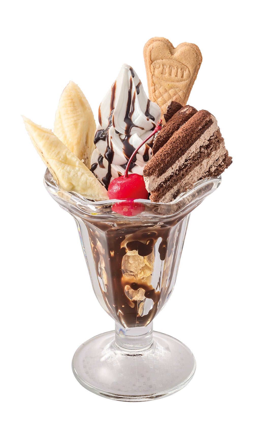 ふんわり食感で口どけの良いチョコレートケーキを贅沢にトッピング。更に厚めにカットしたバナナのフレッシュな味わいとチョコレートの味わいが相性抜群なパフェです。トッピングにはチェリーやハート形のウエハースをトッピングすることで、見た目も可愛らしく、どこかレトロ感を感じていただきながらお楽しみいただけます。