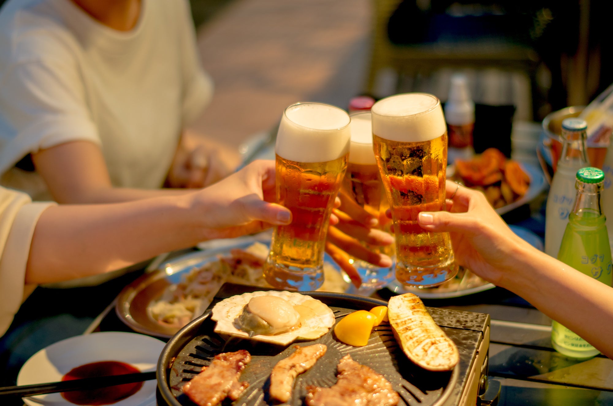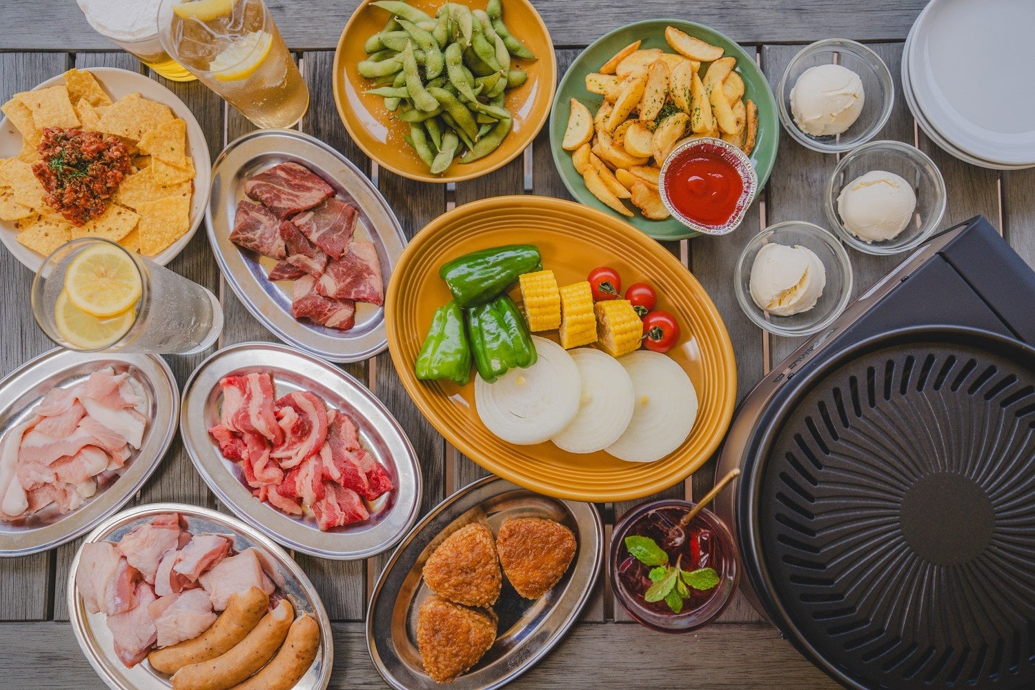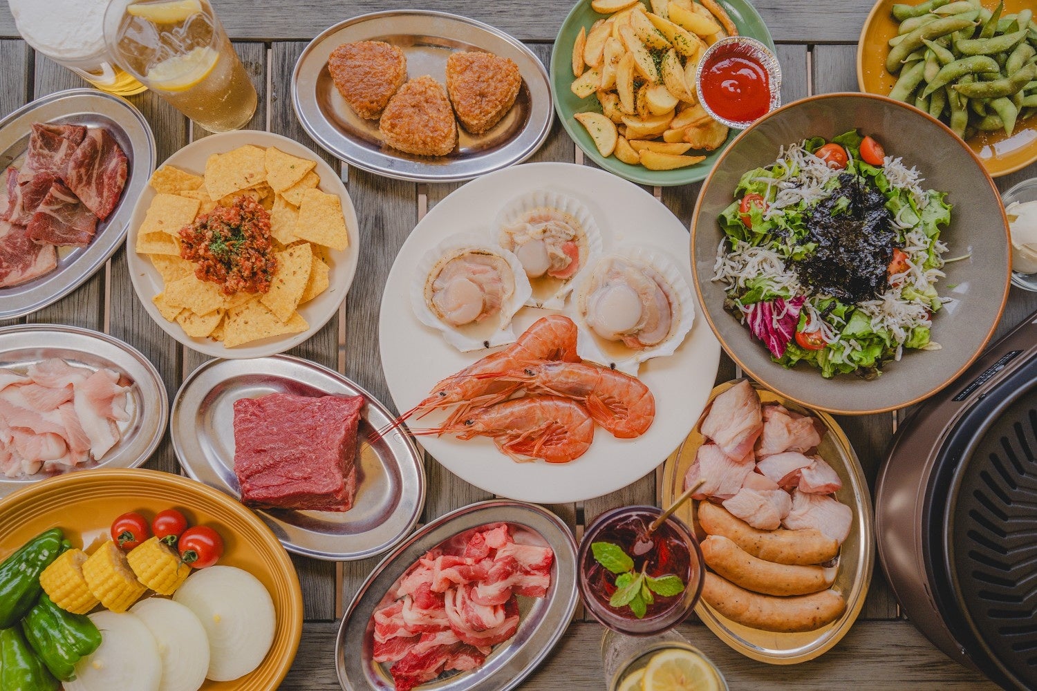 今年のBBQプランは2種類をご用意しており、2時間飲み放題付きの「駅直結!手ぶらでテラスBBQ!おつまみ/お肉5種/野菜4種のベーシックプラン」はスパイシー枝豆などおつまみにはじまり、カルビ・ロースなどのお肉、香ばしい焼き味噌おにぎりやデザートが楽しめるプランです。また、2.5時間飲み放題付きの「駅直結!手ぶらでテラスBBQ!ホタテ・海老に牛ステーキも楽しめる豪華プラン」は、ベーシックプランに加えて、ホタテや海老のシーフード、ザブトンのステーキ塊肉ステーキなどの豪華食材をご用意いたしました。