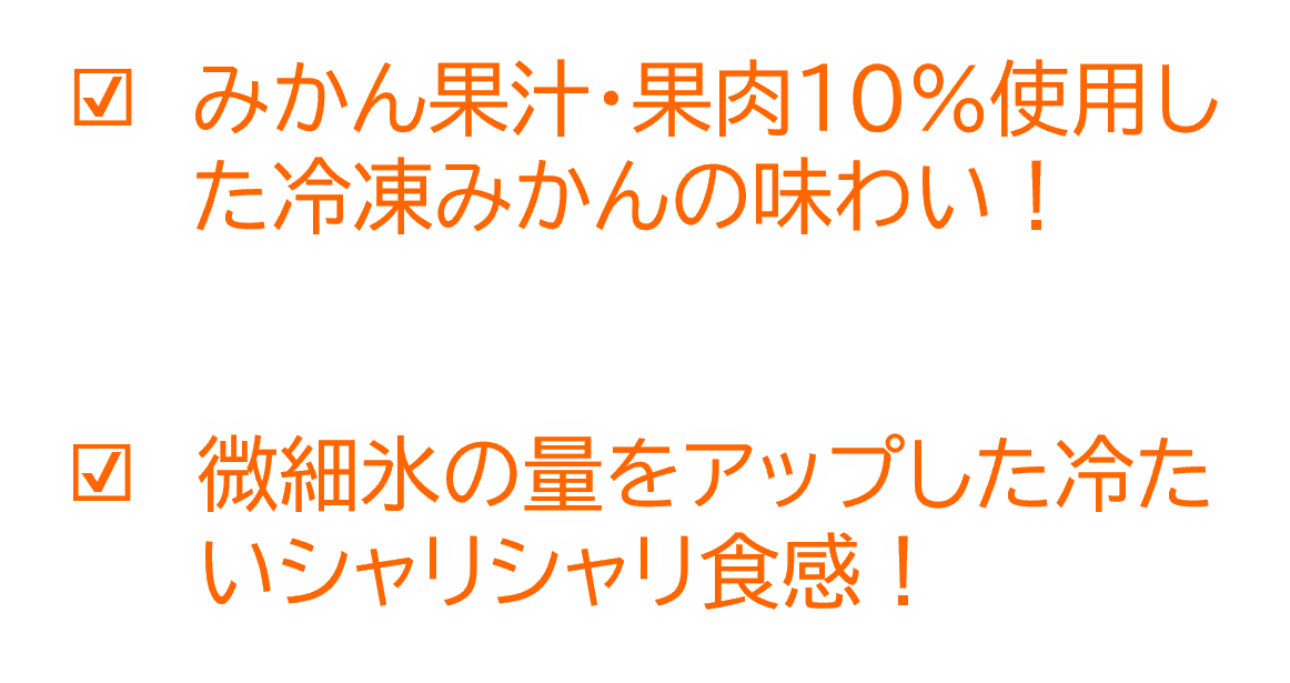 冷凍みかんの風味を引き立たせるために、みかん果汁・果肉を10%使用した、みかんのフルーティーな味わいが楽しめます。