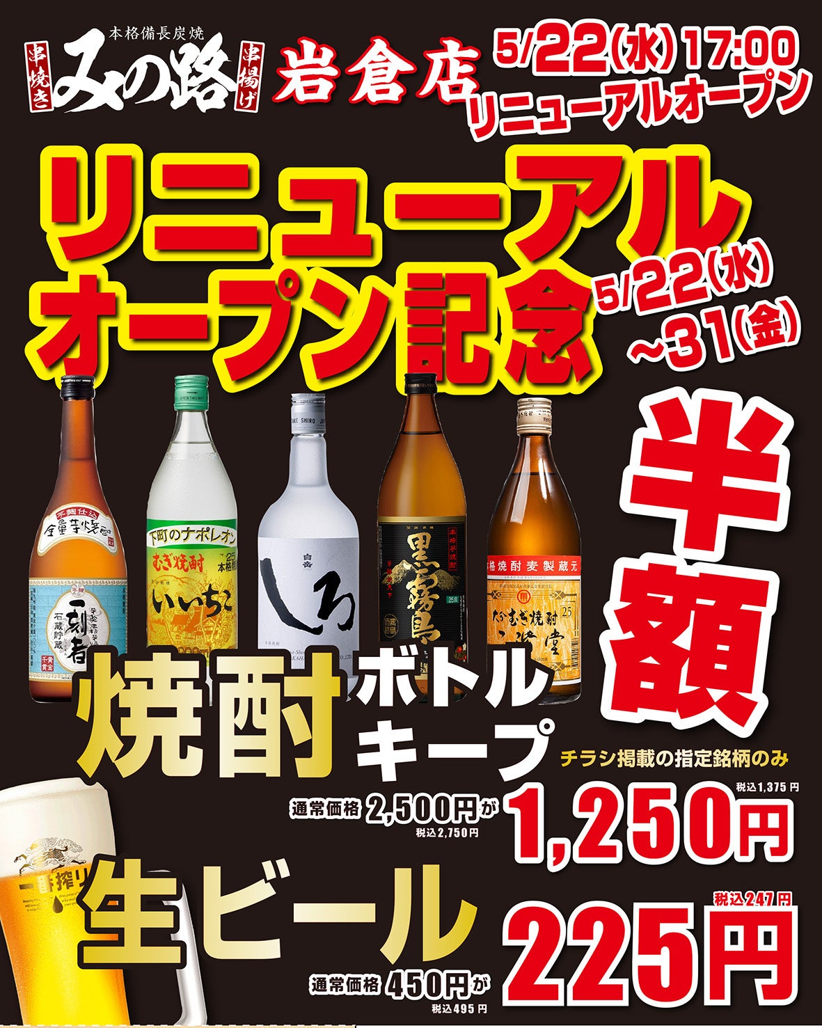 リニューアルオープン記念で5月31日までは『生ビール半額』と『焼酎ボトルキープ半額』イベント開催します!