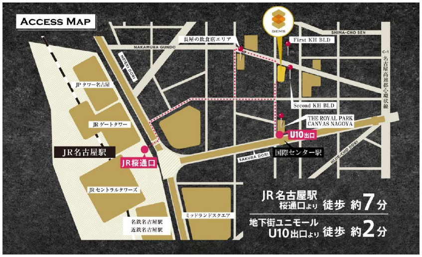 『GEMS名駅三丁目』は、今後のリニア中央新幹線開通に向けて更なる発展が期待される名古屋駅から徒歩7分の距離に位置しております。『GEMS名駅三丁目』はフロアごとにテーマを設け、訪れるたびに新しい発見がある施設として計画いたしました。地元名古屋エリアの有名店、名店や名古屋初進出のテナント等も誘致し、住む人、働く人だけでなく、他府県や世界から多くの人々が訪れるこの地に何度でも足を運びたくなるような、贅沢で居心地の良い商業施設を目指します。