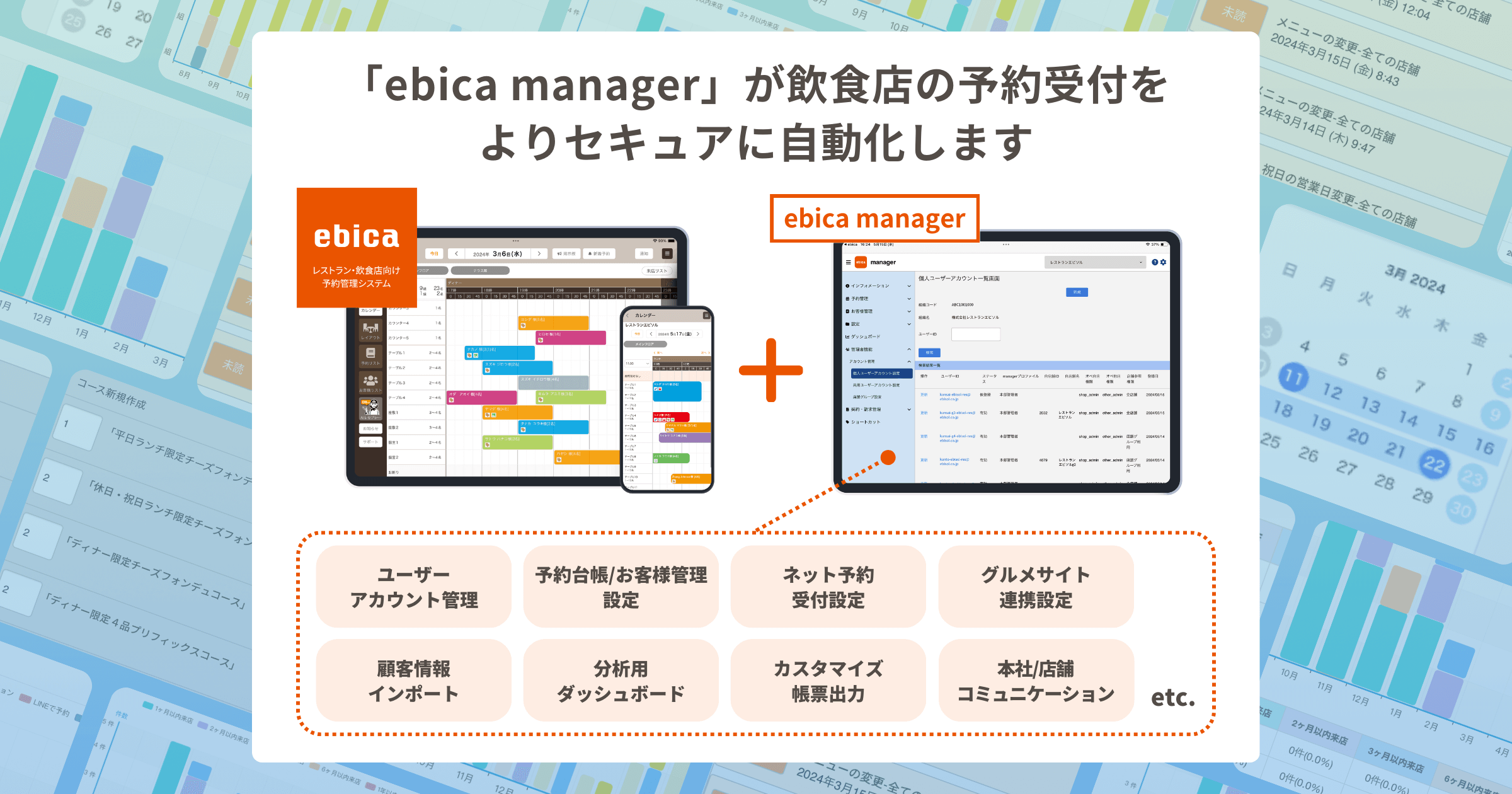 新しくリリースした「ebica manager」では、店舗が予約受付や接客時に利用していた「ebica オペレーション画面」の各種設定機能を改善し、特に複数店舗を経営する飲食企業にとってより効率良く予約受付および集客最大化が可能となります。