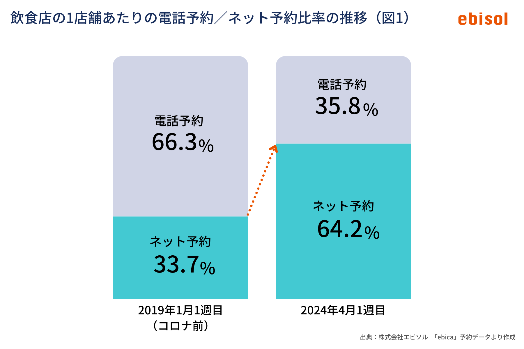 外食産業における電話予約とネット予約の比率(図1)を見ると、コロナ禍以前の2019年冒頭は電話予約が66.3%、ネット予約が33.7%であるのに対して、2024年4月にはネット予約が64.2%と大きく逆転しており、飲食店にとってネット予約運用の重要度は年々高まっています。「ebica」では今回のアップデートにより、ネット予約の運用において最適な店舗運営のための機能追加とセキュリティの向上を実現しました。