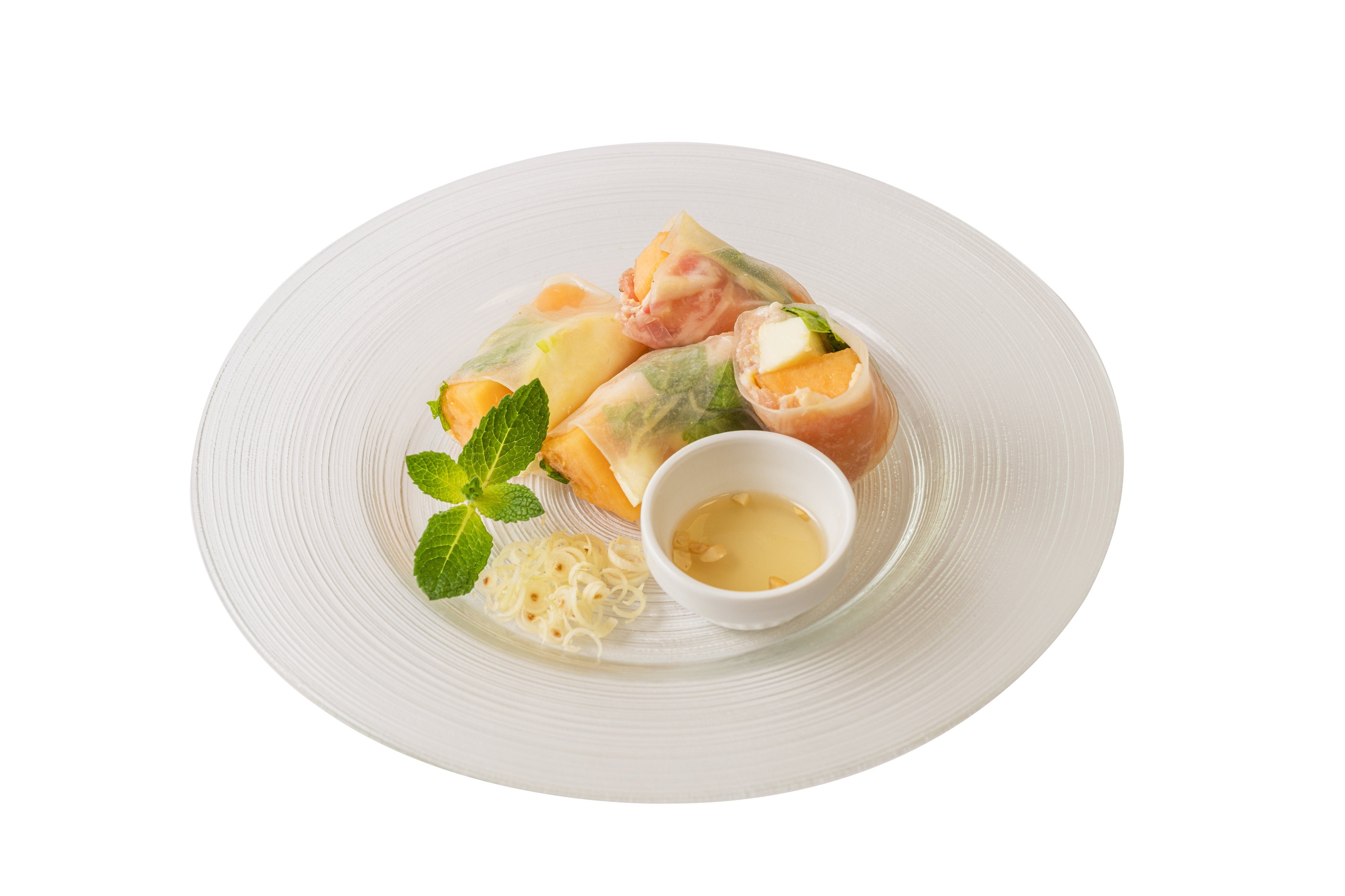いばらきメロンと好相性の生ハムとチーズを生春巻きにアレンジ。エスニックなアレンジを加えた新感覚オードブル。