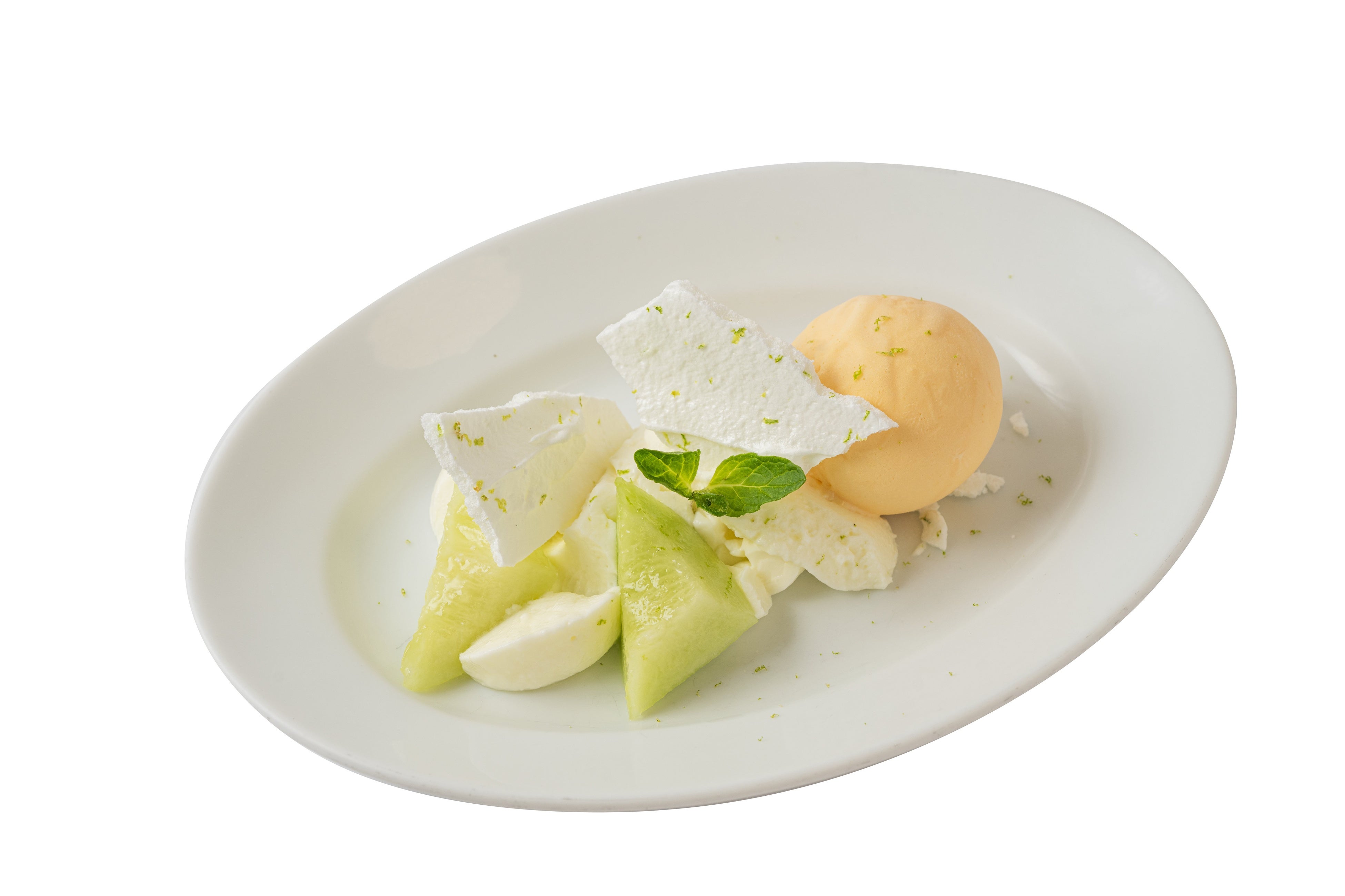 イバラキングのジューシーな果肉を生かしたヨーグルトムースと滑らかなクインシーのアイスクリームを合わせた、初夏の爽やかなデザート。