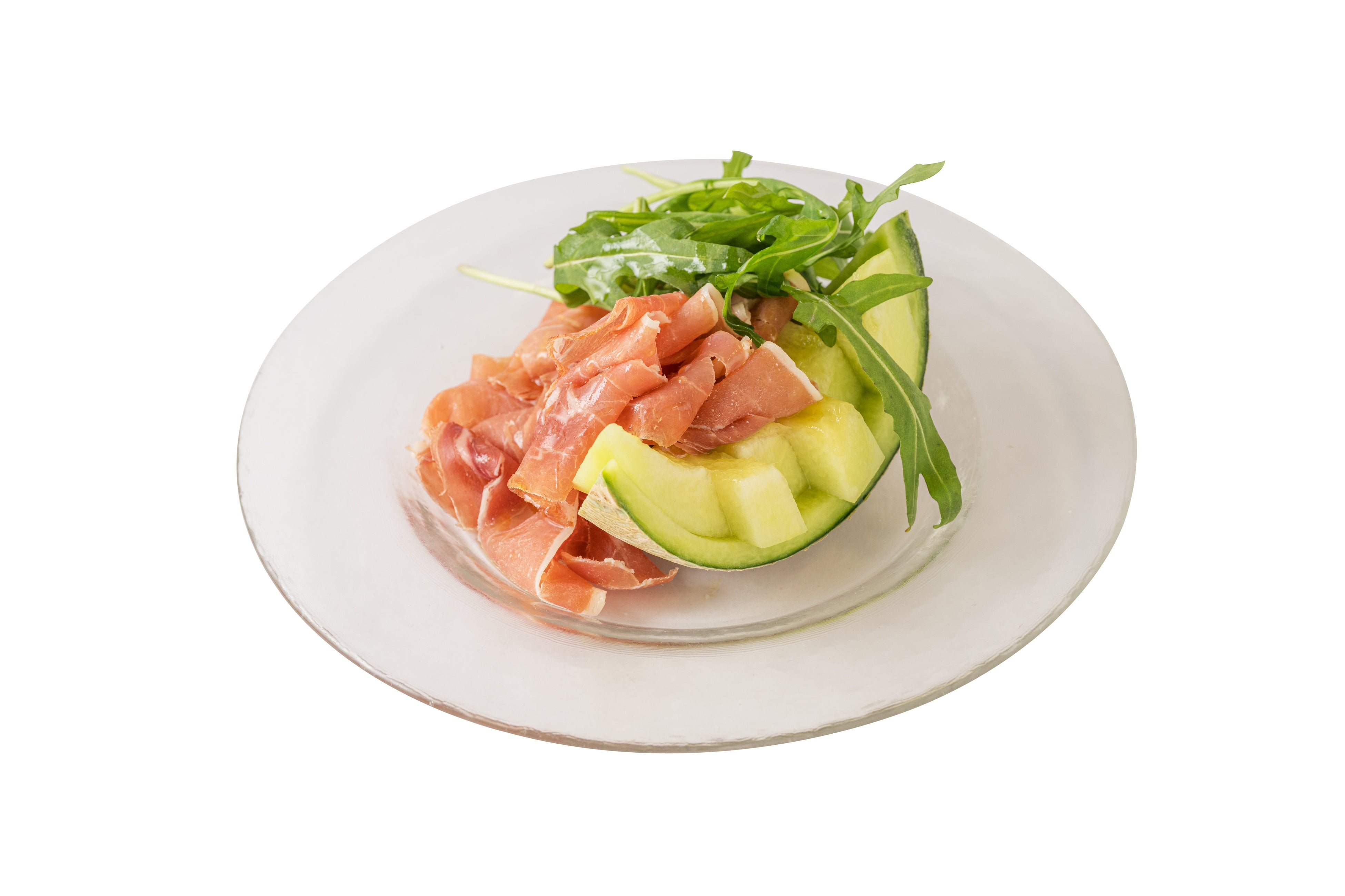 ハモンセラーノの塩味とうまみが、いばらきメロンの甘みを引き立たせる。品種ごとに異なるメロンの味わいも楽しんで。