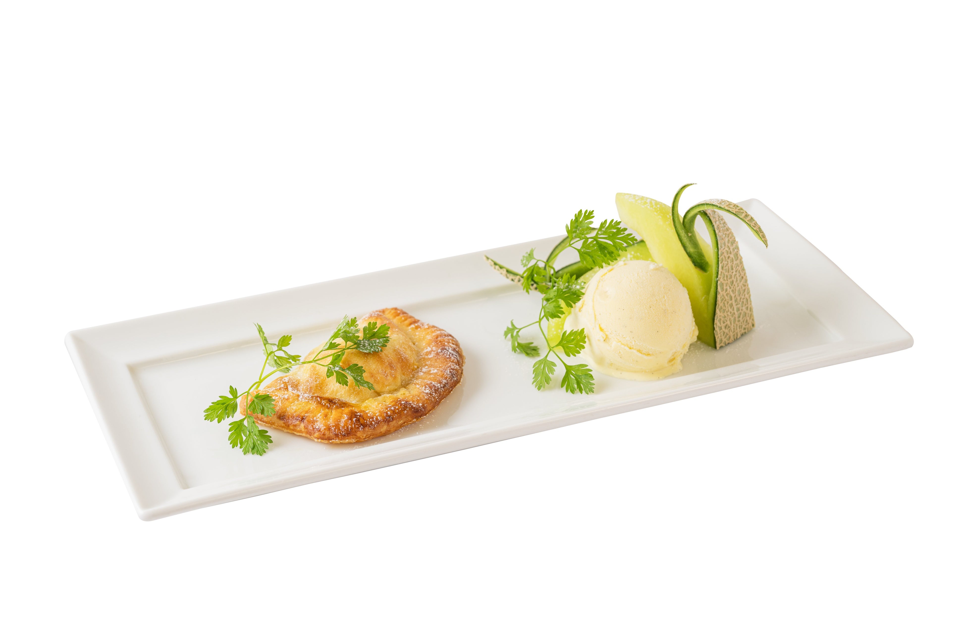 いばらきメロンをスペイン風のパイ包みに仕上げた当店シェフ特製デザート。バニラアイスと合わせてどうぞ!