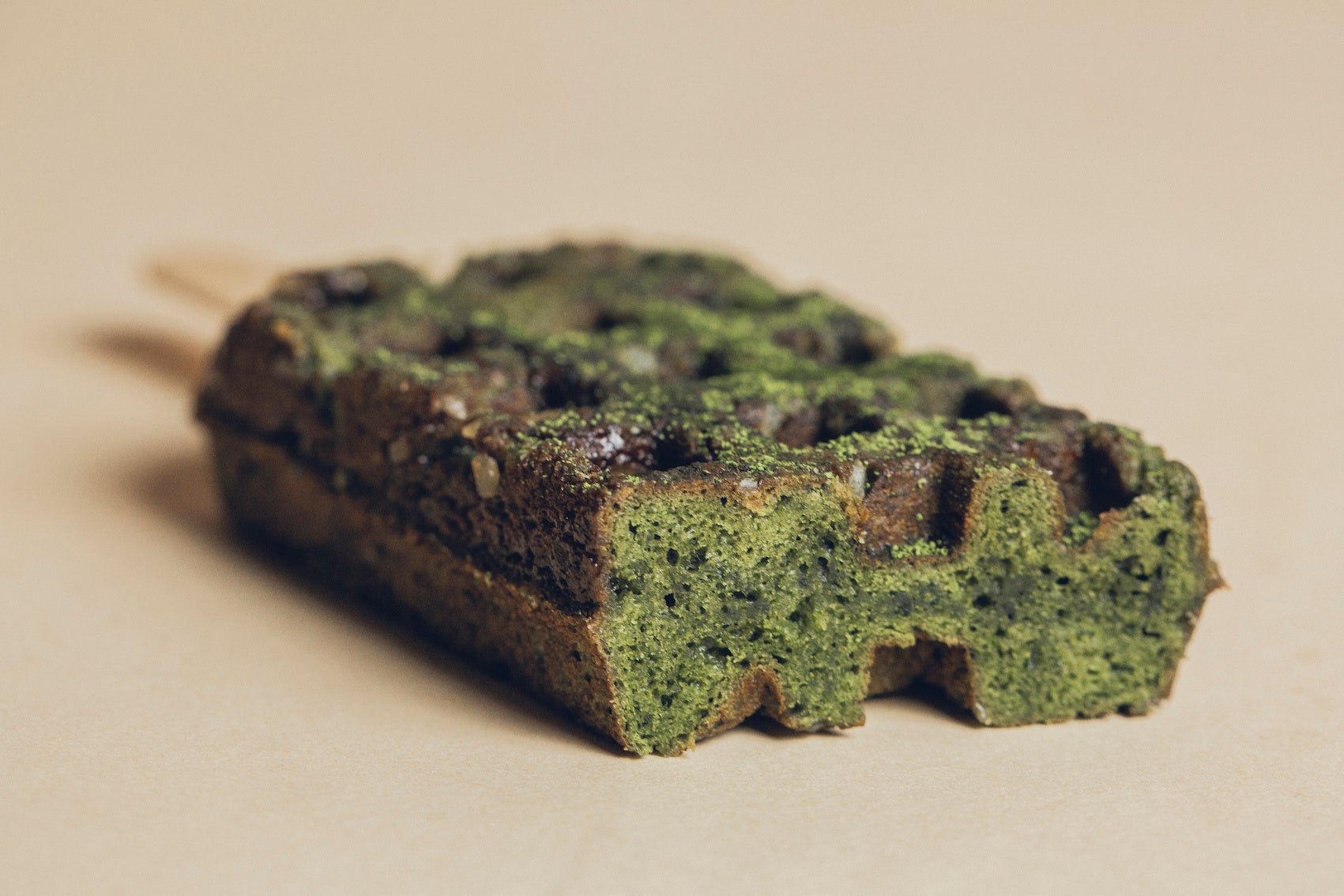 催事限定フレーバーの「ほうじ茶」は、大粒ザラメが入った京ワッフルの生地に、ほうじ茶の粉末をたっぷり練り込みました。独特の香ばしさと、濃厚で優しい後味が楽しめます。