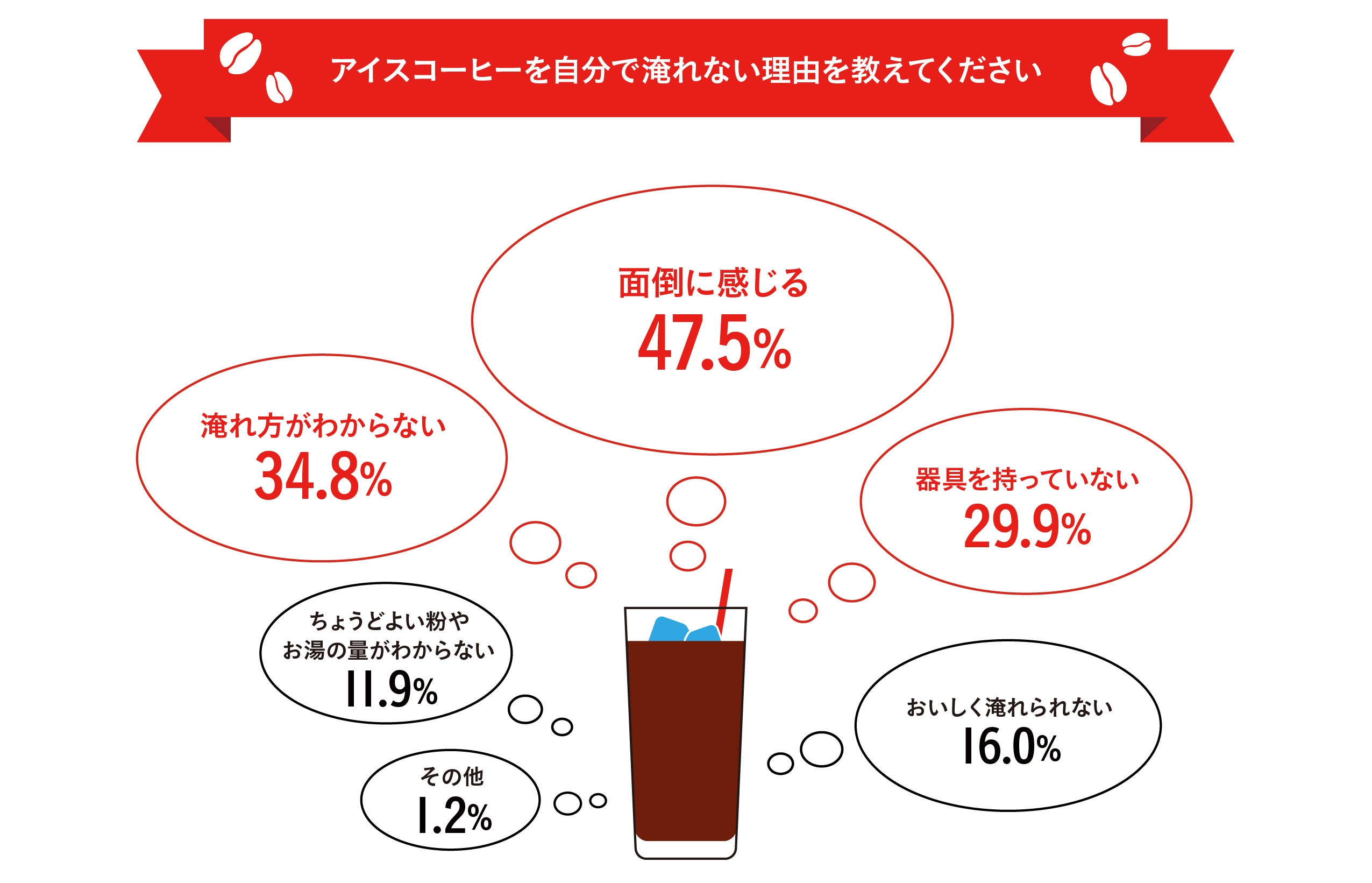 ⚫ ホットコーヒーを「自分で淹れる」と答えた人は約6割なのに対し、アイスコーヒーを「自分で淹れる」と答えた人は約3割とホットコーヒーの半分にとどまった。アイスコーヒーを自分で淹れない理由としては「面倒に感じる」が第1位で約5割、「淹れ方がわからない」が第2位で約3.5割であった。