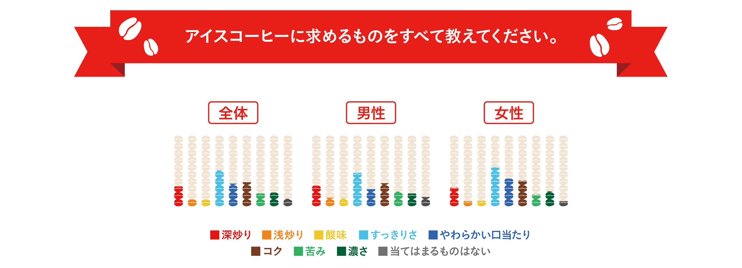 「アイスコーヒーに求めるもの」については男女ともに1位は「すっきりさ」(51%)となりました。次点では、「コク」(34.5%)、「やわらかい口当たり」(31.7%)が続く結果となり、特に女性は「やわらかい口当たり」を求める人が39%と高い傾向となりました。
