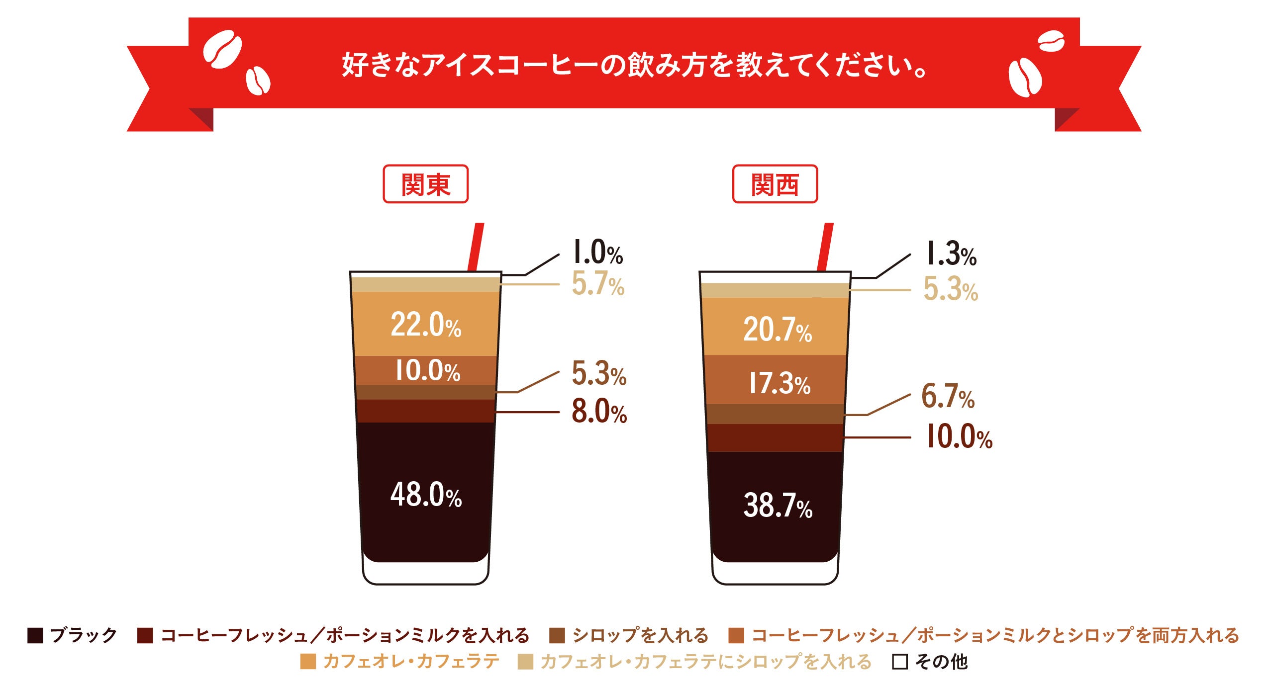 好きなアイスコーヒーの飲み方については関東と関西で地域差が見られ、関東在住の人は「ブラックで飲む」派が48%であったのに対し、関西では38.7%となり、関東の方がブラックを好む人が多いことが分かりました。
