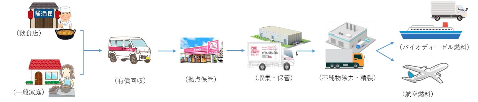カクヤスの各拠点にて回収した廃食用油は社内物流センターおよび各配送センターに集約され、レボインターナショナルが引取りを行います。その後、レボインターナショナルにおいてバイオ燃料化(SAF)され、廃食用油が再資源化される仕組みとなります。