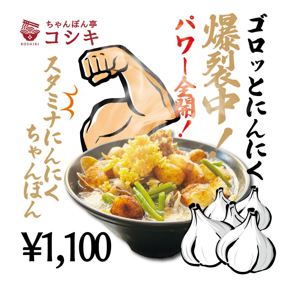 創業から12年、ちゃんぽん亭コシキを支え続ける8種の具材をじっくり煮込んだオリジナルちゃんぽんをベースに。 生にんにく15片を丸ごとオイルでじっくり火を通し、食感抜群のにんにくの芽を投入して仕上げた 特製にんにくオイルをホクホクのにんにく15片とともに、食べる直前にお客様の目の前で「ジュワー」という音をたてながらおかけさせていただきます。