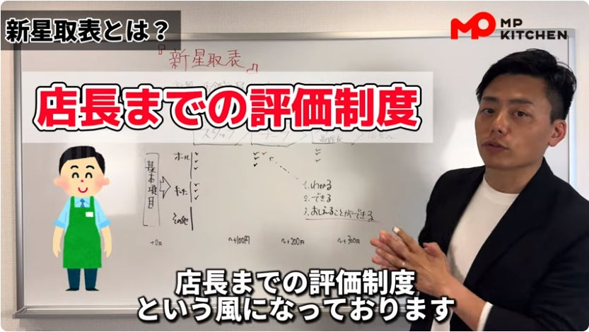 店舗社員・パートアルバイトさんを対象としたこちらの評価制度は、自身のステップアップと共に時給も上がっていく仕組みとなっております。公式YouTubeチャンネル『エムピーキッチンTV』では、社長の石川が当制度について解説している動画と、実際に当制度によって副店長へ抜擢されたアルバイトスタッフへのインタビュー動画を2本公開しておりますので、是非ご覧下さい。