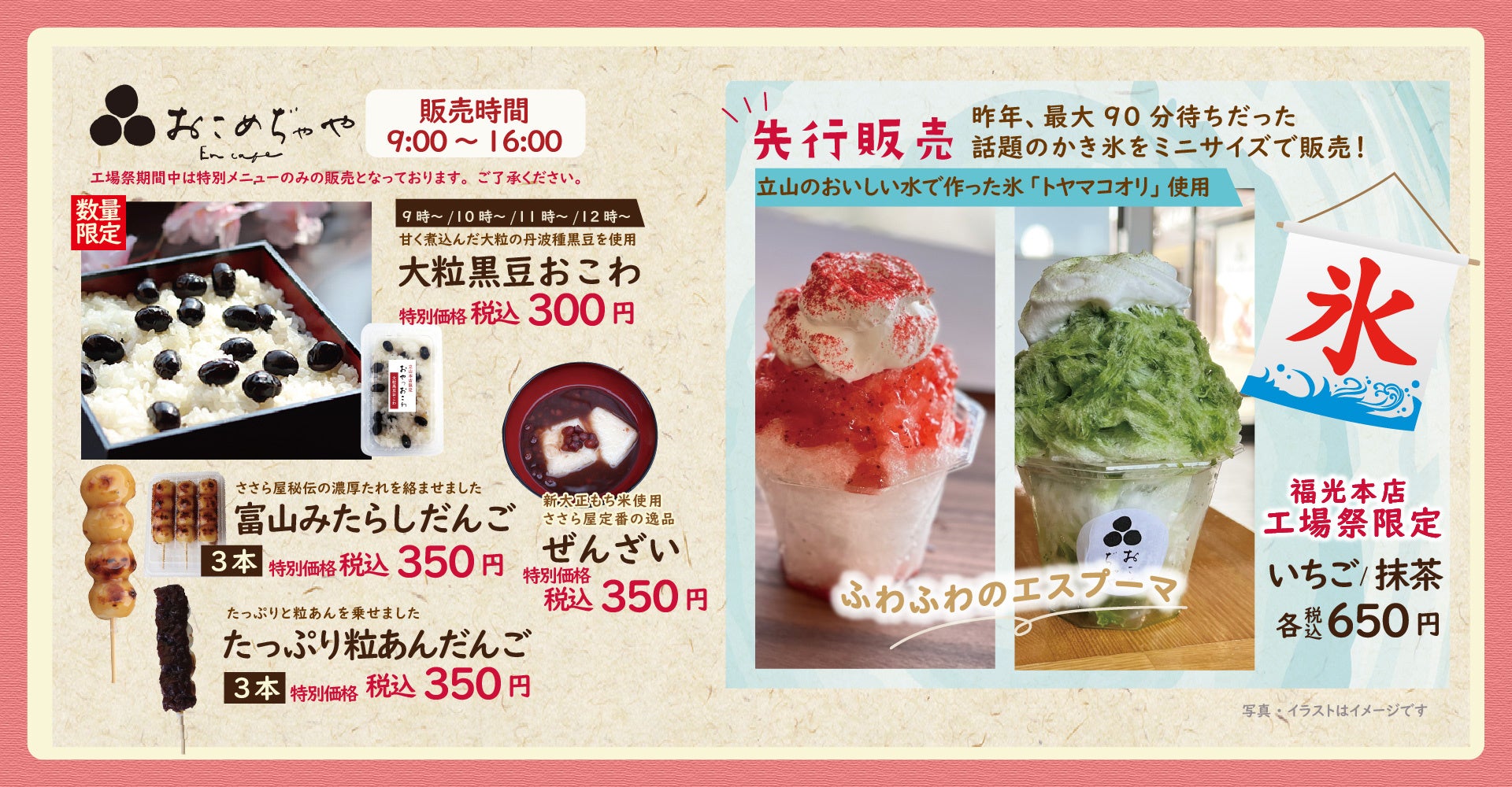さらに今年は、昨年夏に最大90分待ちの行列になるほどの大人気となりました「氷ささら屋」のオリジナルかき氷のミニサイズが福光本店工場祭限定で先行発売!立山の雪解け水で作った氷「トヤマコオリ」のふわふわ食感を夏前に一足先にお楽しみいただけます。