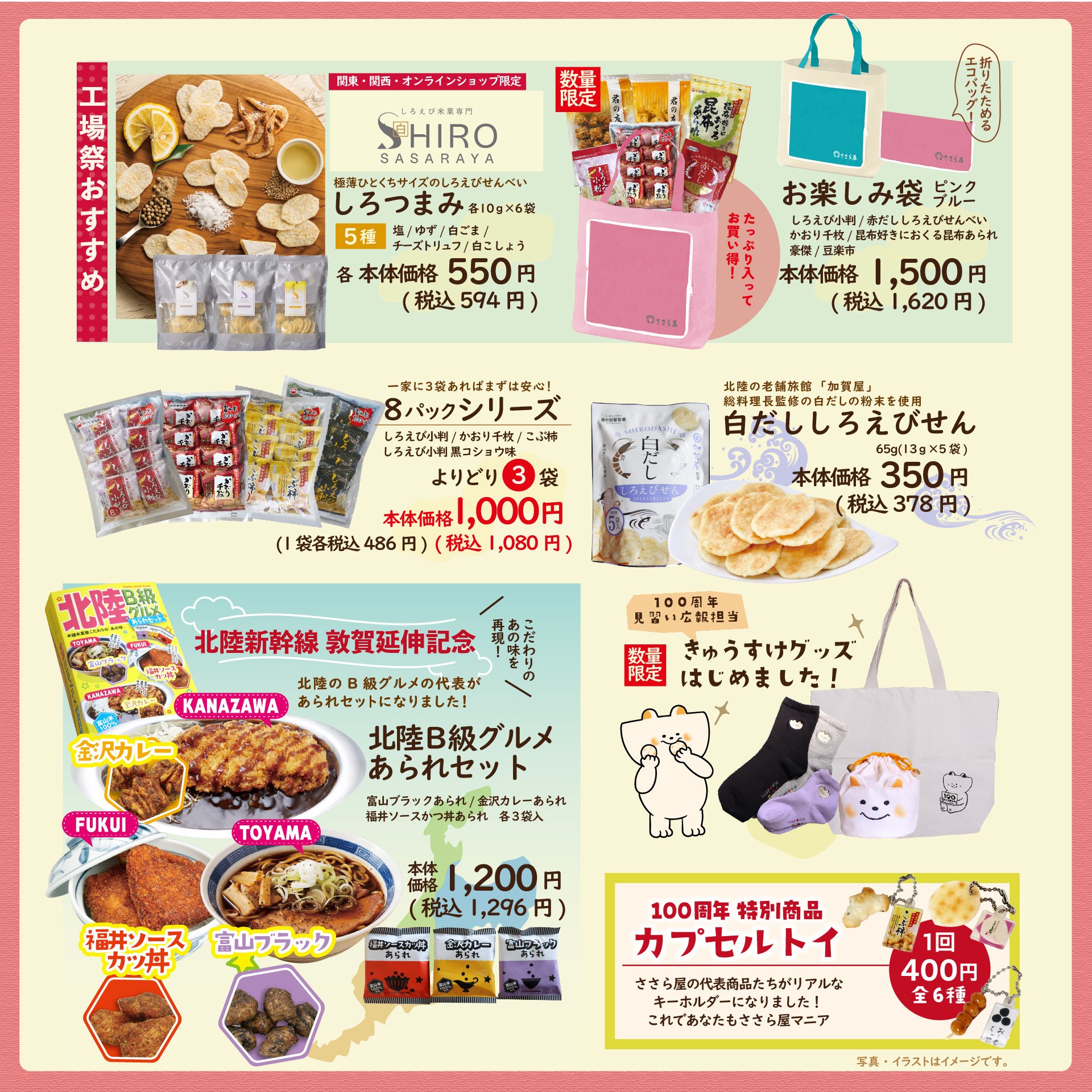 毎回ご好評のささら屋オリジナルエコバックに入った詰め合わせ「お楽しみ袋」、工場祭限定の「8パックシリーズよりどり3袋」企画、東京・関西のポップアップストアやささら屋公式オンラインショップ限定ブランド”SHIRO SASARAYA(白・ささらや)”の「しろつまみ」などの商品を春の工場祭限定で販売いたします。