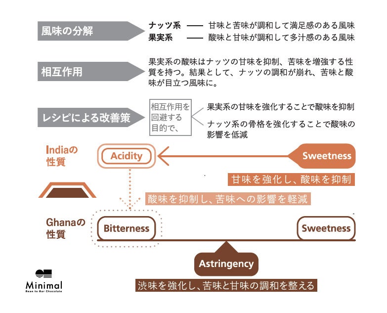 今回は、カカオ豆のもつ味わいとしては相反する2つの風味の相性について実験しました。