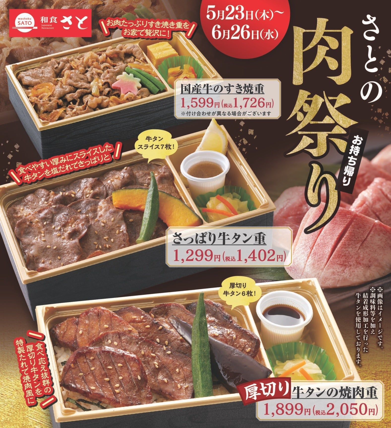 国内197店舗を展開する「和食さと」では、「厚切り牛タン」や「スライス牛タン」をテイクアウトメニューで堪能できる「肉祭り」キャンペーンを、5月23日(木)から6月26日(水)までの期間限定で開催します。