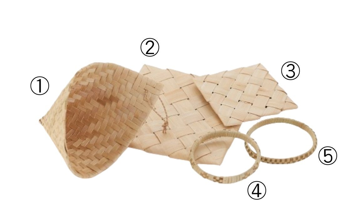 <民具なかぎり>①月桃ドリッパー 4,800円 ※20点限り ②月桃鍋敷き 2,500円 ※20点限り ③月桃コースター 1,200円 ※40点限り ④アダン デジバングル(細)2,400円 ⑤アダン デジバングル(ミンサー柄)3,600円