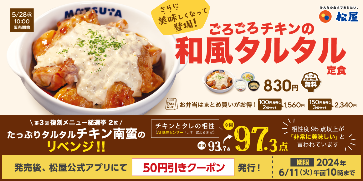 商品名 ごろごろチキンの和風タルタル定食 830円 ※お持ち帰りいただけます。お持ち帰りにみそ汁は付きません。 お持ち帰りの場合、みそ汁は別途60円でお求めいただけます。 ※税込み価格です。 ※株主優待券は上記メニューにご使用いただけます。 発売日 2024年5月28日(火)午前10時 ~ 対象店舗 一部店舗を除く全国の松屋 |