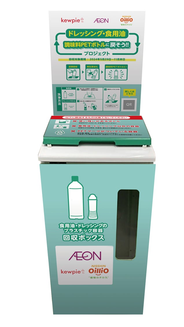 キユーピー株式会社(本社:東京都渋谷区、代表取締役 社長執行役員:髙宮 満、以下キユーピー)と日清オイリオグループ株式会社(本社:東京都中央区、代表取締役社長:久野 貴久、以下日清オイリオグループ)は、ドレッシングや食用油の油が付着したPETボトルの資源循環に向けて、イオン株式会社(本社:千葉県千葉市、代表執行役社長:吉田 昭夫)に協力いただき、千葉市内の「イオン」「イオンスタイル」8店舗にて、5月29日(水)から使用済み油付きPETボトルの回収を開始します。