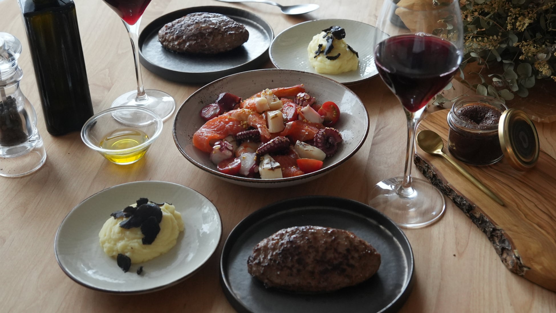 希少なプレミアム和牛「いわて山形村短角牛」を使用したハンバーグと、トリュフの芳醇な香りが食欲をそそるマッシュポテト、シーフードマリネ、トリュフのフォンダンショコラをセットにしました。