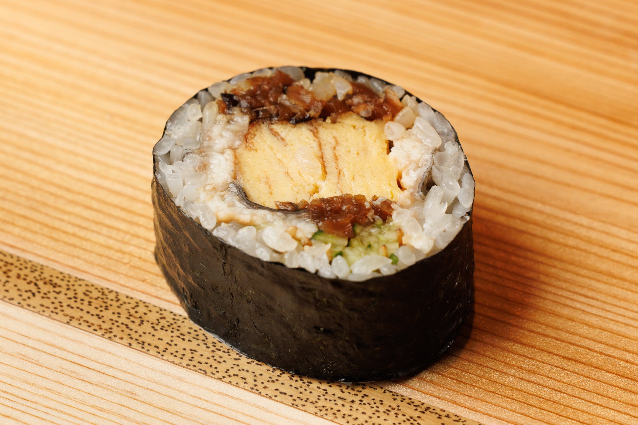 甘めの玉子焼きは出汁をたっぷり含ませているので、太巻きながらもジューシーさを味わえます。食感のアクセントに千切りの胡瓜、そして干瓢(かんぴょう)と椎茸をミンチにして甘辛く炊きあげた【ねりかん】という調味料が全体的に深みとコクを与えます。