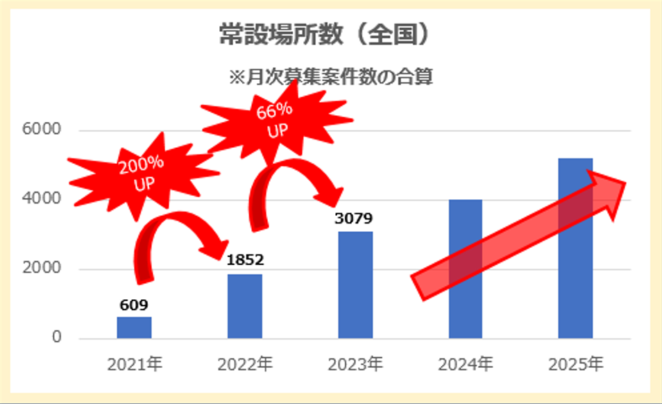キッチンカー(移動販売)の需要増加を反映し、モビマルが扱う常設出店場所数は、年々増加しています。