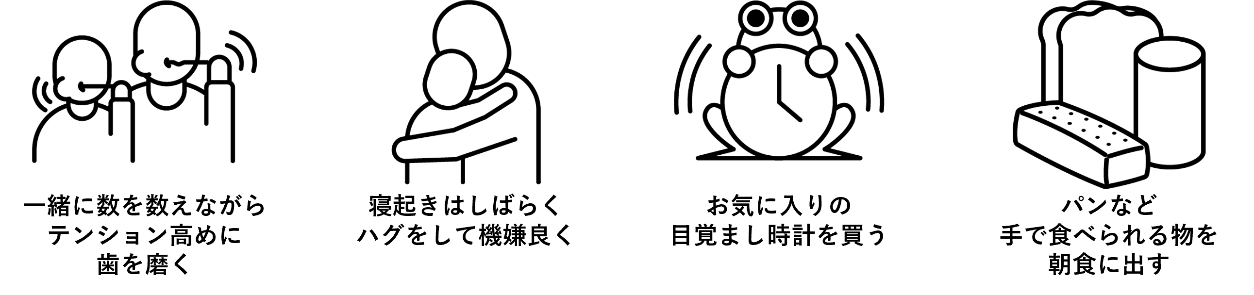 調査では、朝のドタバタを解決するためのご家庭内でのリアルなエピソードが集まりました。「一緒に数を数えながらテンション高めに歯を磨く」や、「寝起きはしばらくハグをして機嫌良く」などゆとりを持って朝の支度をするためのほっこりする工夫の声が多くありました。
