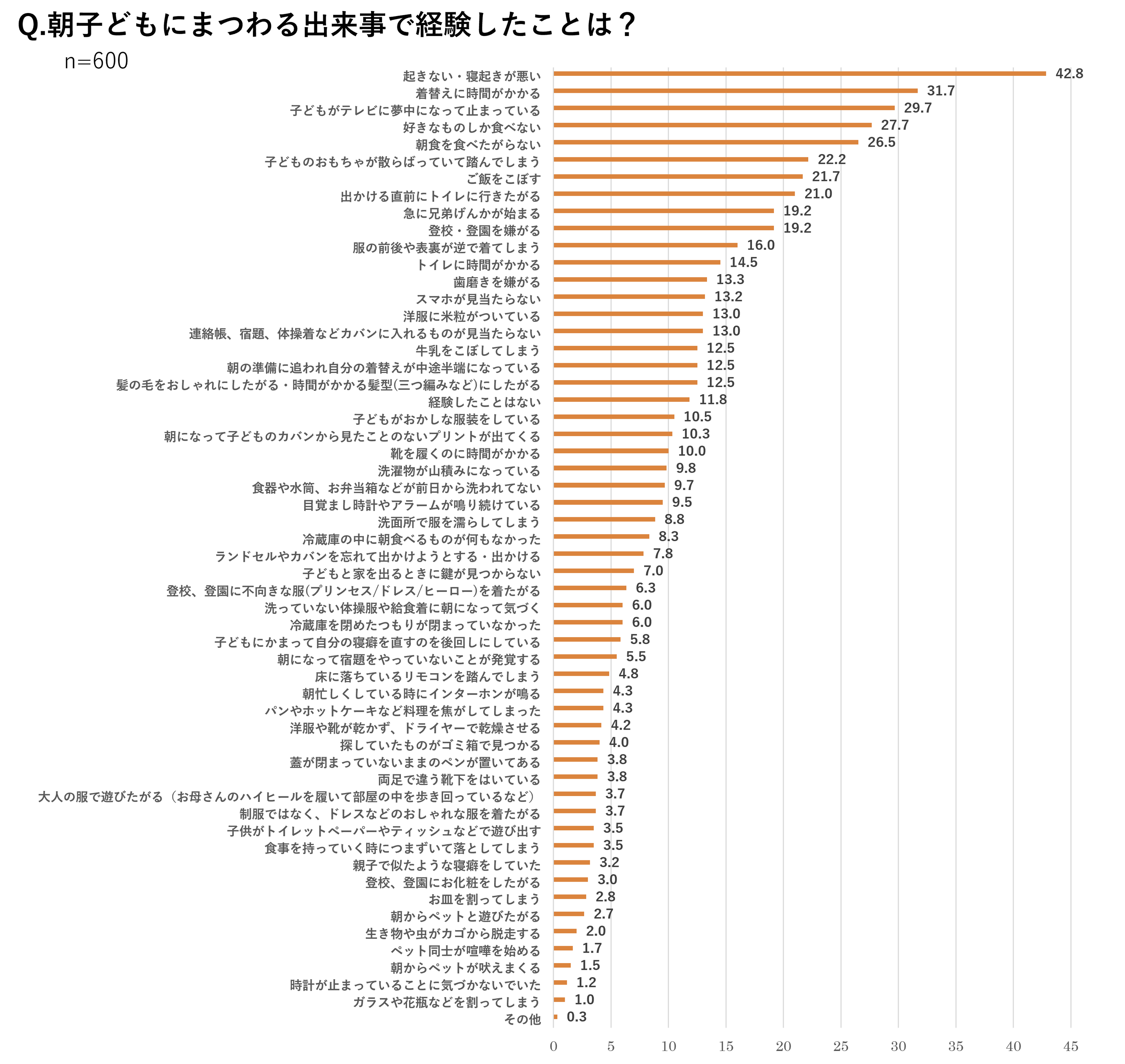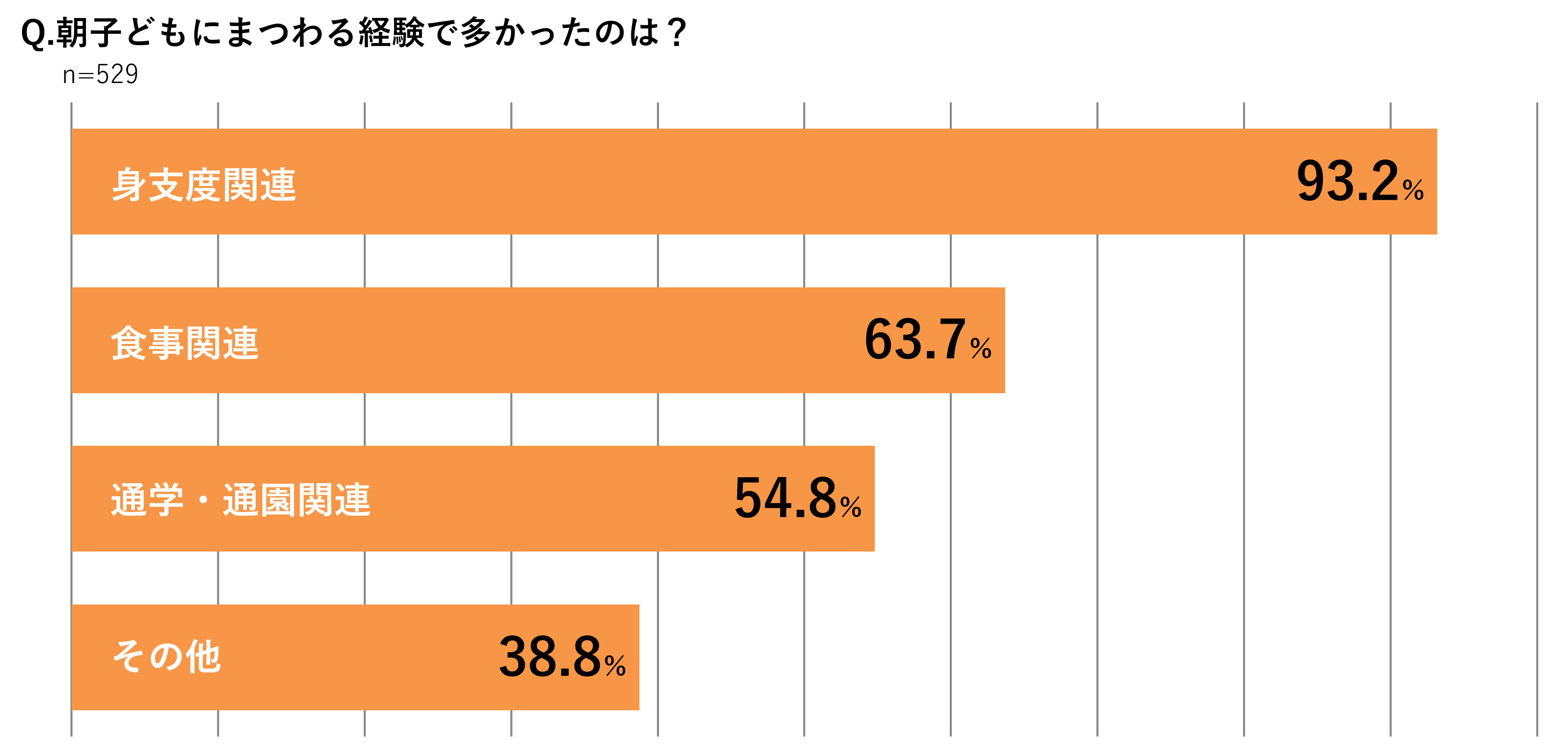 子育て家庭では「子どもが起きない・寝起きが悪い」「朝食を食べたがらない」などの突発的な家事は平均5~6個も経験したことがあることが明らかになりました。また、10個以上の突発的な家事の経験がある親は全体の5分の1もいることが判明。項目別では身支度に関係する「着替えに時間がかかる」などが全体の9割を超えており、次に食事に関連する「好きなものしか食べない」などが6割を超えました。