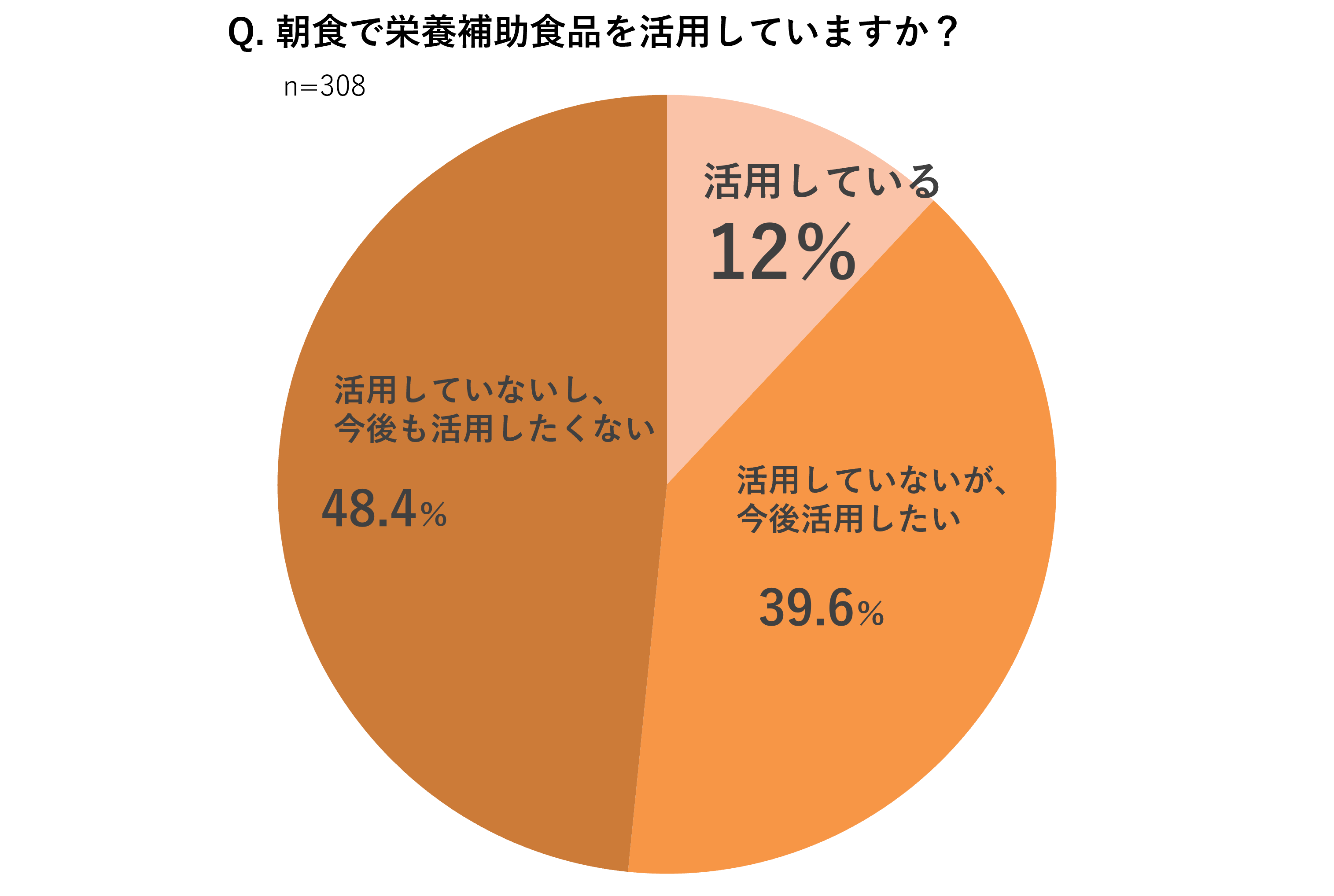 また、活用を検討している方のうち18%は、栄養補助食品を「子どもと一緒に食べられそうだから活用したい」と回答しました。親も子どもと一緒に自分の健康をサポートする食事としても栄養補助ドリンクを捉えていることがわかりました。