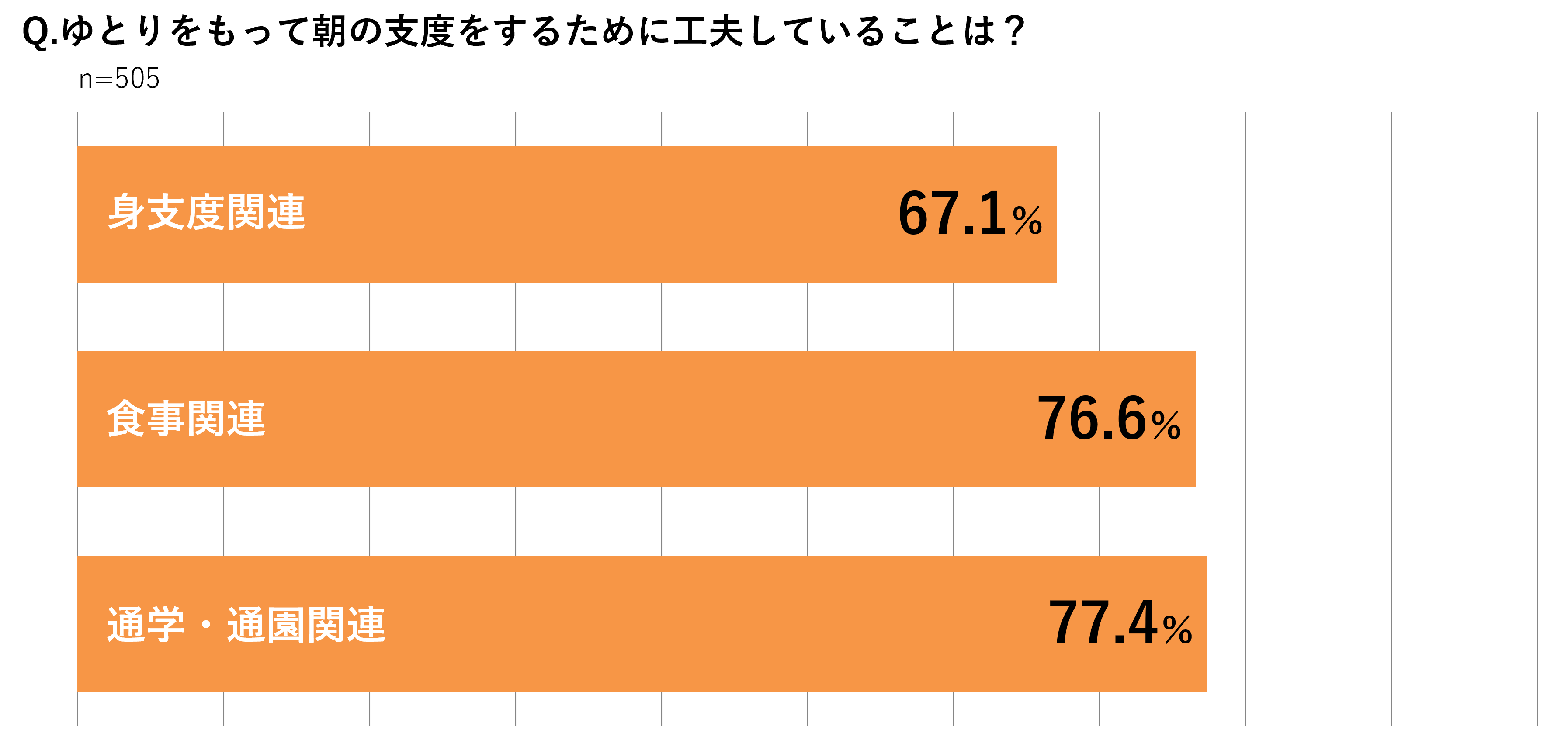 この結果から、子育て家庭では予測できない子どもの行動から、朝の突発的な家事が多く発生し、支度に想定外の時間やタスクが起きていると考えられます。