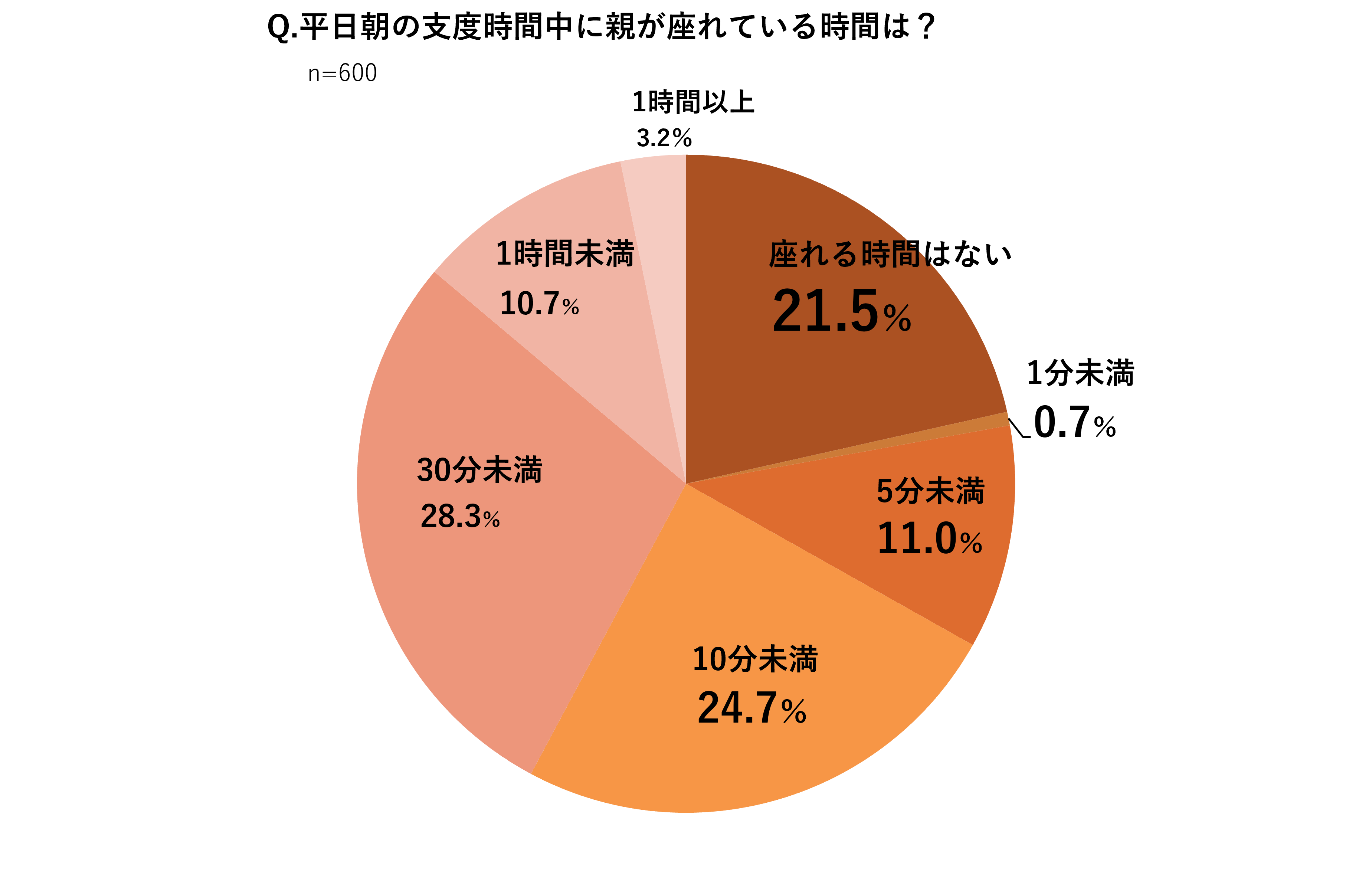 平日の親の朝は、起床してから座れる時間は平均16分という結果でした。また、全体の約20%は「座れる時間はない」と回答しました。起床から登校までの平均1時間30分の支度時間の中で、多くの親が座らずに家事や支度をこなしていることが明らかになりました。