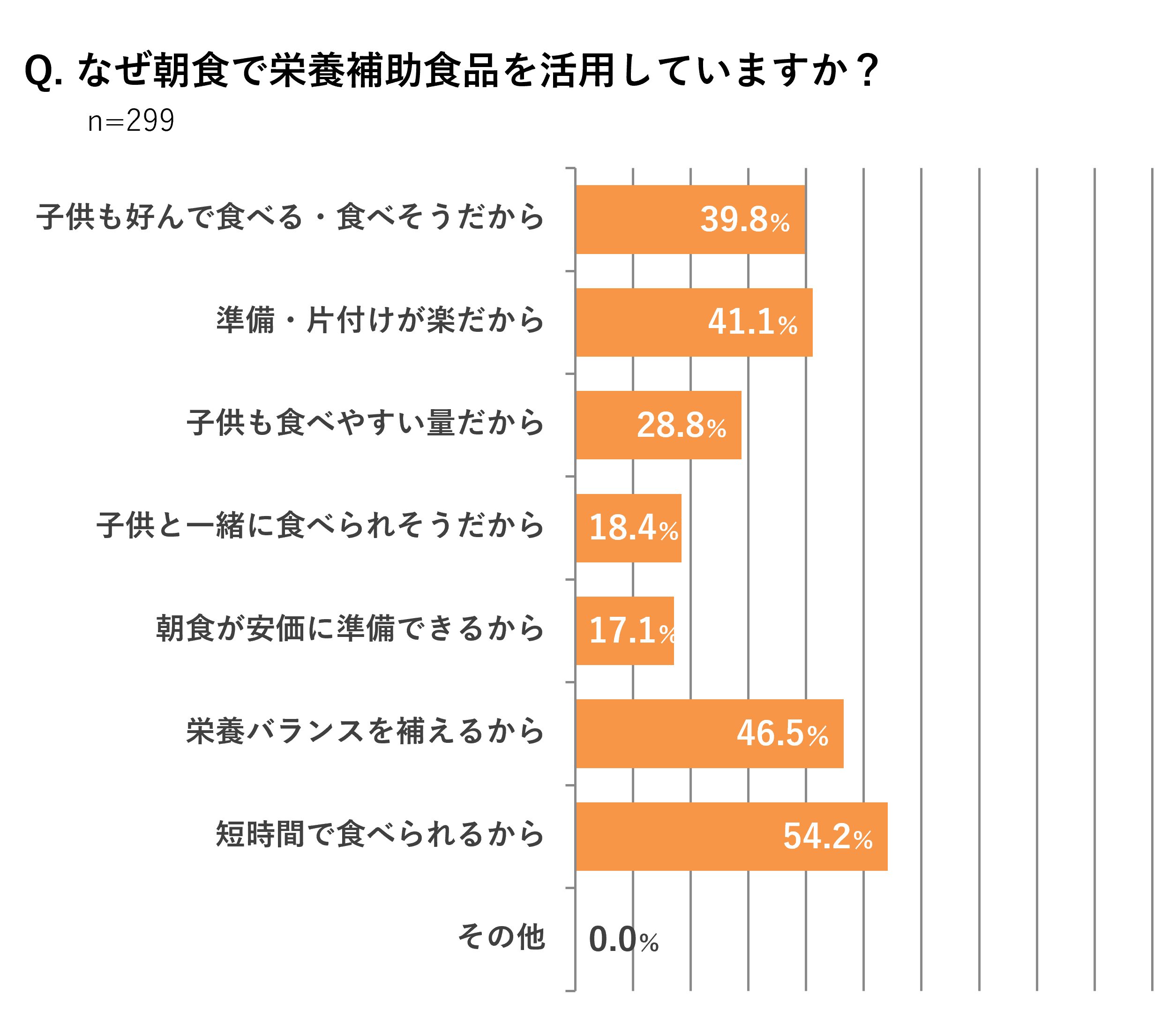 具体的に活用意向のある方からは、「手軽に足りない栄養の補助ができるので良いと思う」、「食が細いので、なかなか食べ進まない中で必要な栄養が取れるのは嬉しい」、「平日の朝は時間もなく、子どもたちも休日の朝ほど食欲がないので、手軽にササッと栄養が摂れるのは非常にありがたいから。」など忙しい朝を助けてくれるなどの声が集まりました。
