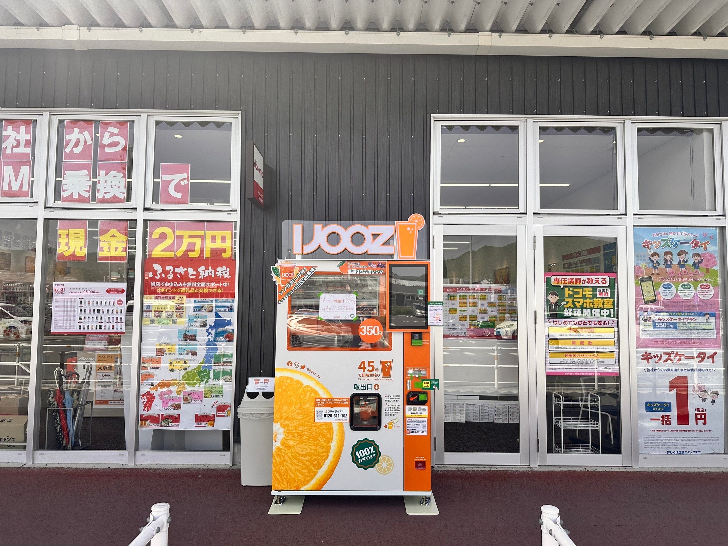 IJOOZのオレンジジュース自動販売機が「イオンタウン各務原鵜沼」のビッグ棟 ドコモショップ店頭で、稼働を開始しました。施設を利用する一人でも多くの方に、手軽に美味しいオレンジジュースを楽しんでいただければと考えています。