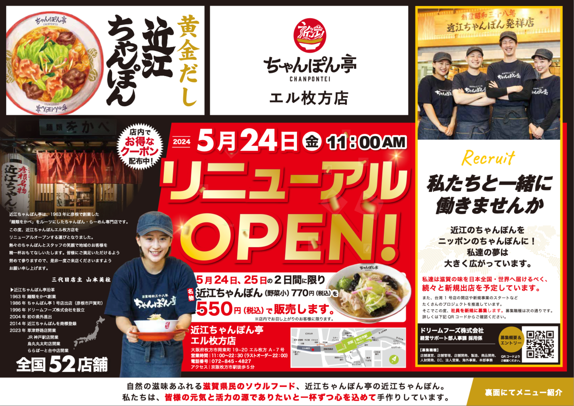 「近江ちゃんぽんをニッポンのちゃんぽんに!」をブランドビジョンに、「近江ちゃんぽん亭(以下同店という)」を展開するドリームフーズ株式会社(滋賀県彦根市 代表取締役 山本英柱、以下同社という)は、「近江ちゃんぽん亭 米原店」が2024年5月24日(金)からリニューアルオープンします。