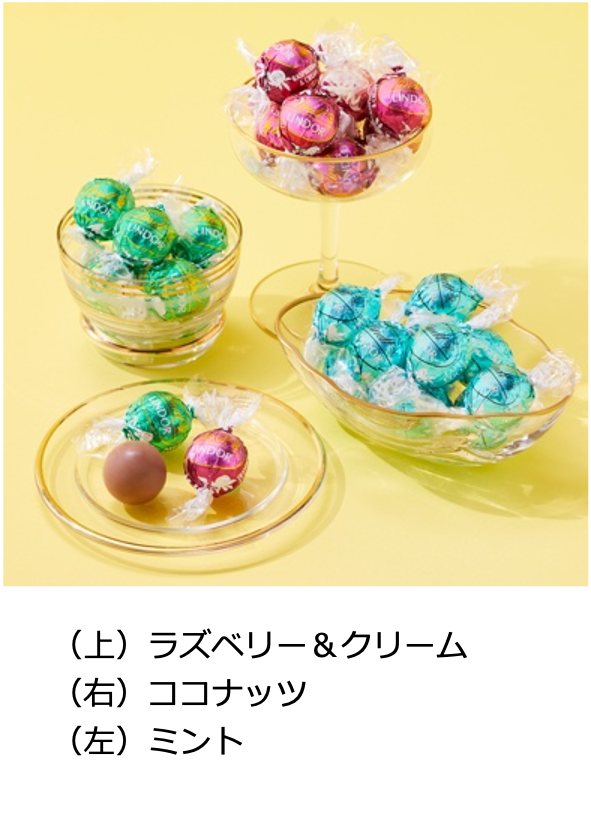 夏限定のリンドールフレーバー「ラズベリー&クリーム」「ココナッツ」「ミント」の3種類が登場します。それぞれのフレーバーはこれからの暑い季節にぴったり。「ラズベリー&クリーム」はフレッシュな酸味とクリームのまろやかさがマッチし、心地良い甘さに。「ココナッツ」はトロピカルな香りと味わいが口いっぱいに広がります。「ミント」は爽快感のあるフレーバーとなっており、すっきりとした味わいをお楽しみいただけます。この夏だけの特別なリンドールで、贅沢なひとときをお楽しみください。