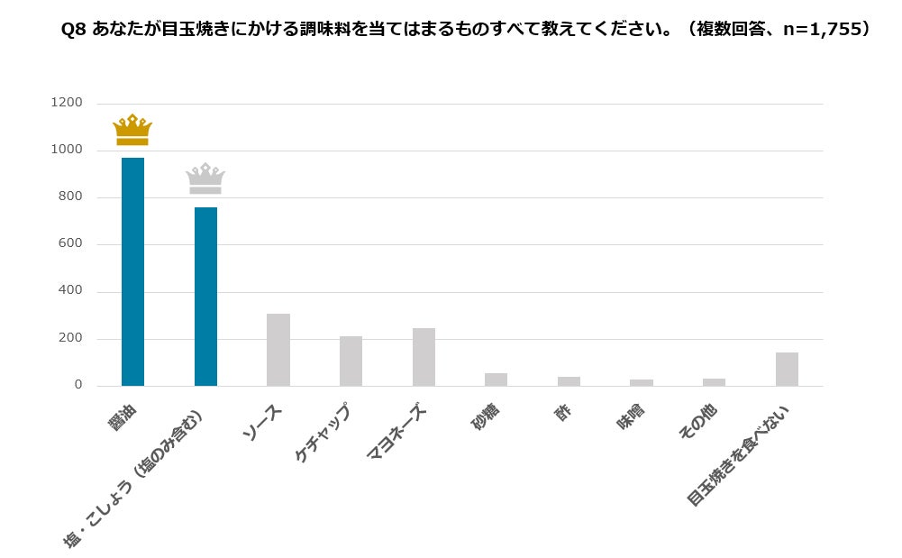 ◇Q8「あなたが目玉焼きにかける調味料」として選択されたもの、1位:醤油(973人)、2位:塩・こしょう(762人)、3位:ソース(308人)。2位と3位は2倍以上の差となり、目玉焼きにかける調味料は二分化の傾向が見られました。