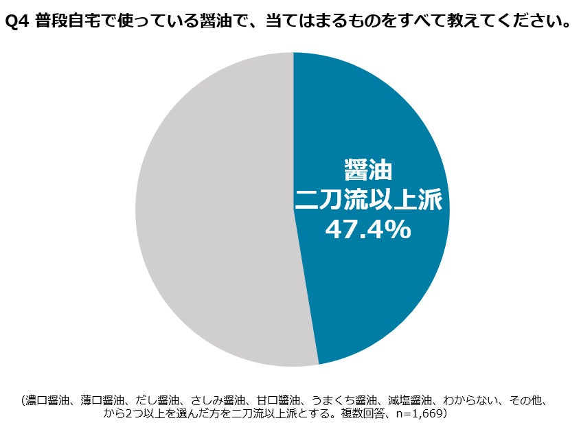 ◇さらに、Q4で普段使っている醤油を2つ以上選択した“醤油二刀流以上派”は47.4%と高めの割合となり、物価高の中でも醤油は食べるものに合わせて揃えていることがわかりました。