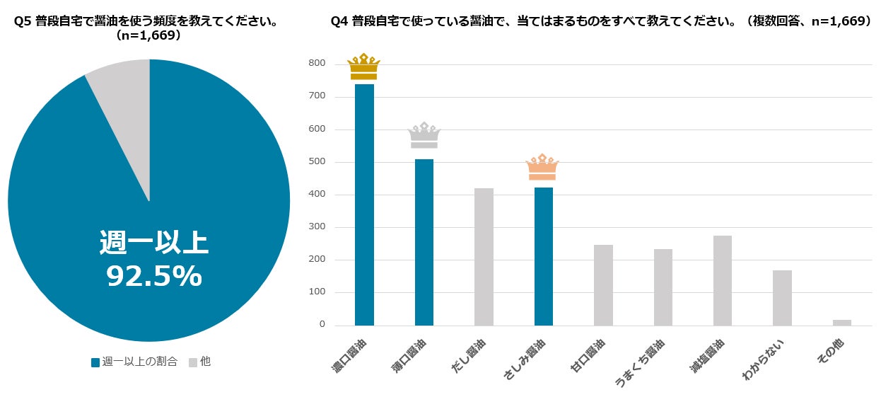 Ⅲ.醤油を使う頻度は週1回以上が92.5%と、大半が頻度高く使っている状況。さらに2種類以上の醤油を使っている“二刀流以上派”は全体の47.4%と高め。